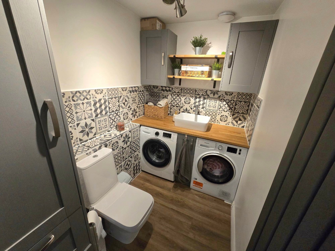 Re-configured and upgraded with storage cupboards. Wooden work surfaces with space for washing machine and tumble dryer below and basin over. Low level WC. Contemporary abstract tiling.