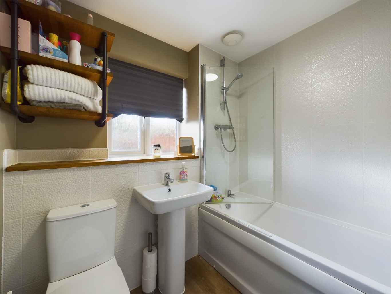 Obscure double glazed window to rear elevation. Chrome ladder style radiator. Suite comprising panelled bath and shower, pedestal wash hand basin and low level WC.