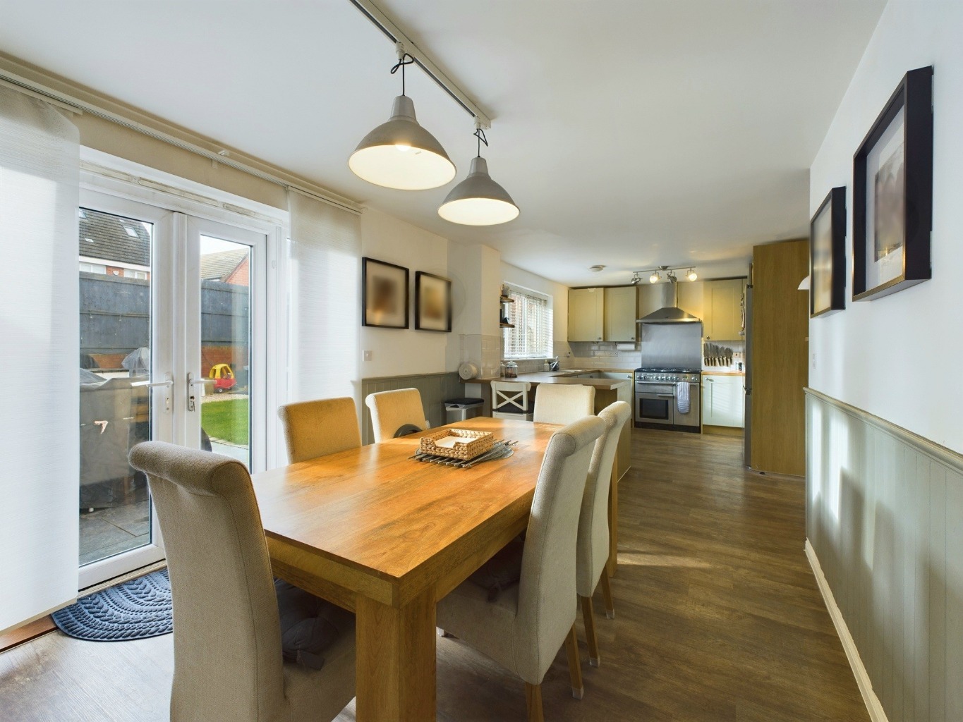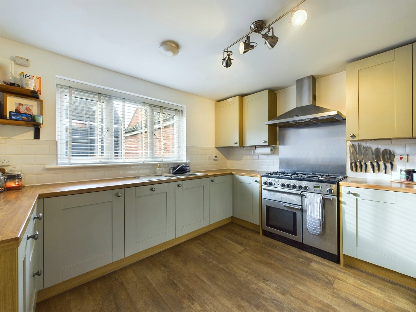A fabulous open space spanning the full width of the property. Contemporary units with work surfaces over. Single drainer one and a half bowl sink unit with mixer tap and metro style tiling. Built in dishwasher. Space for Range style cooker and American style fridge/freezer. Luxury vinyl tiled flooring. Double glazed window to rear elevation and French doors to garden.