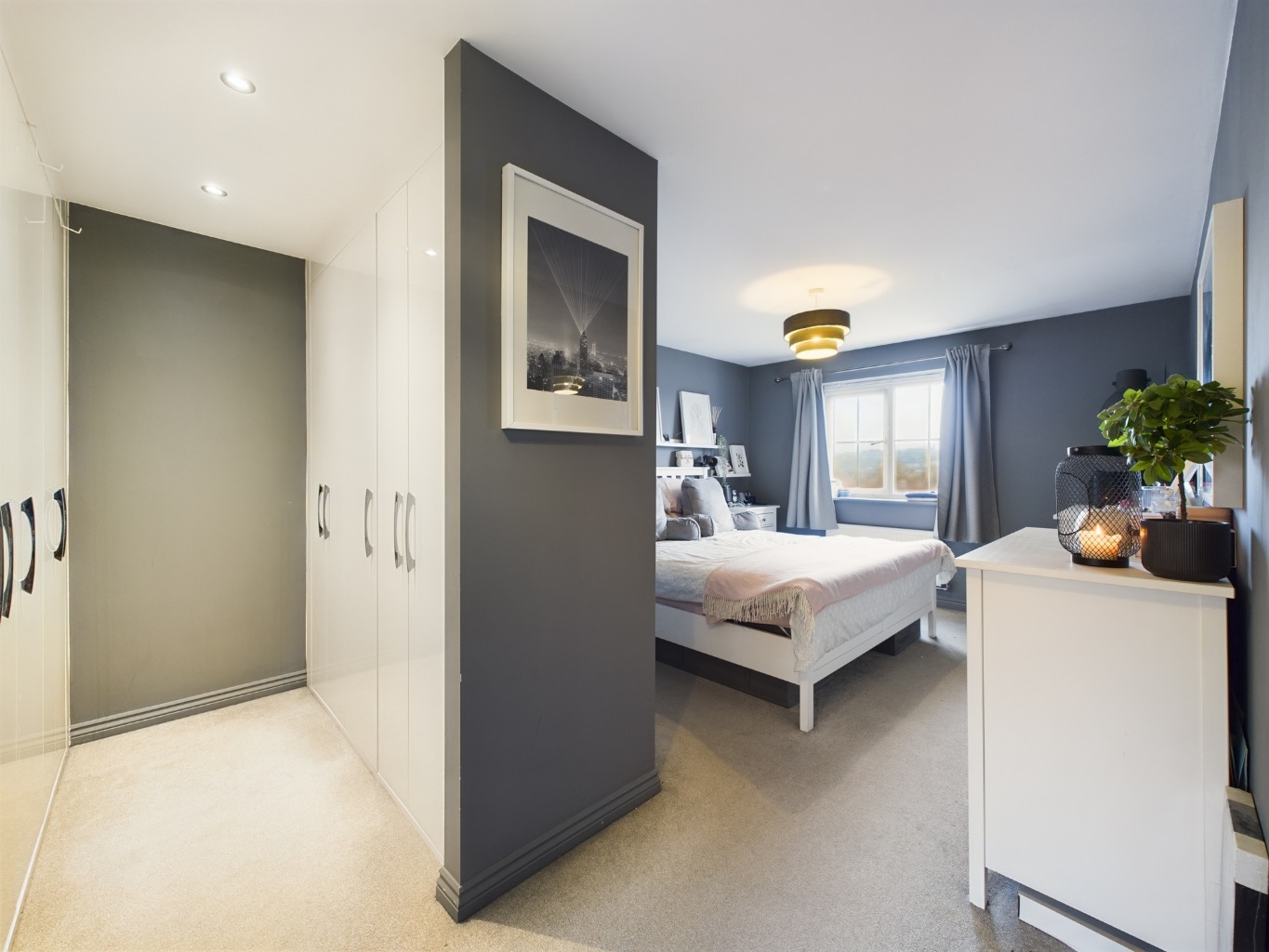 Double glazed window to front elevation. Radiator. Off set dressing area with two banks of fitted wardrobes and separate LED downlighting. Door to: