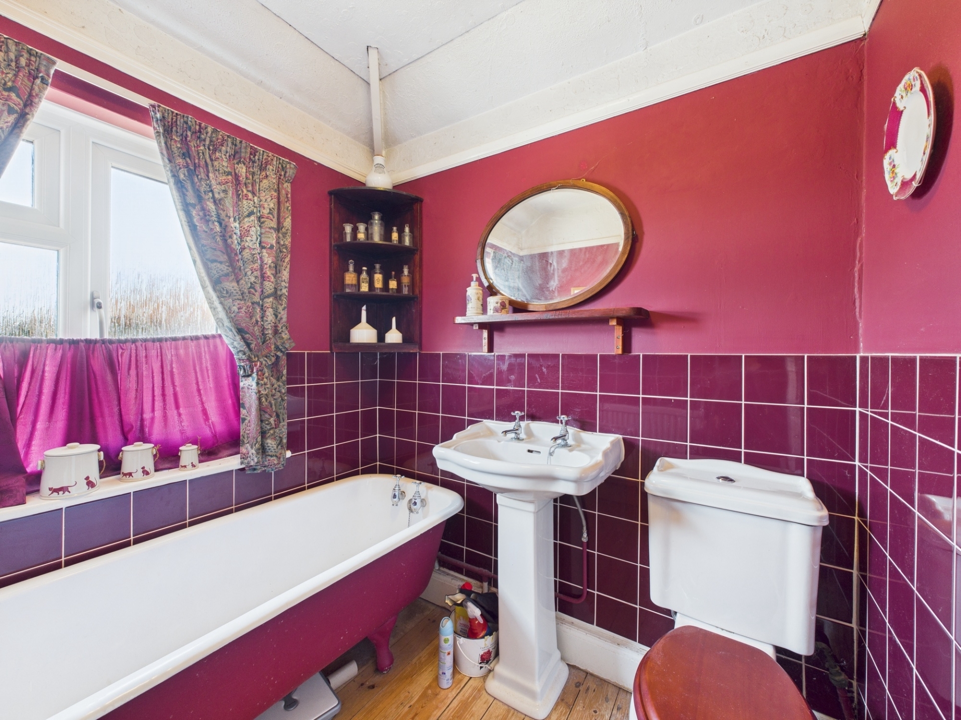 uPVC double glazed window to front elevation. Roll top bath. Low level WC and wash hand basin. Tiled splash back.