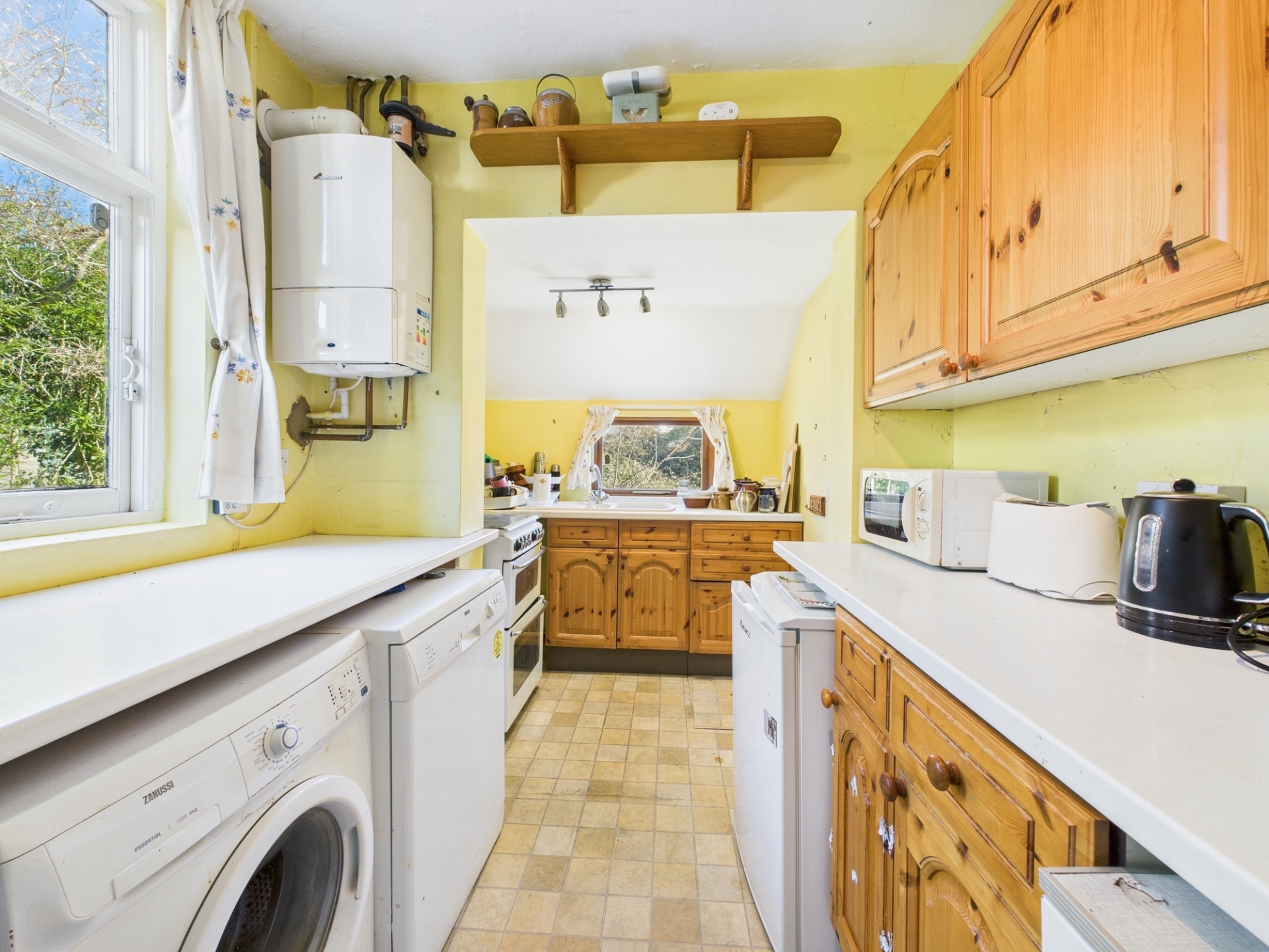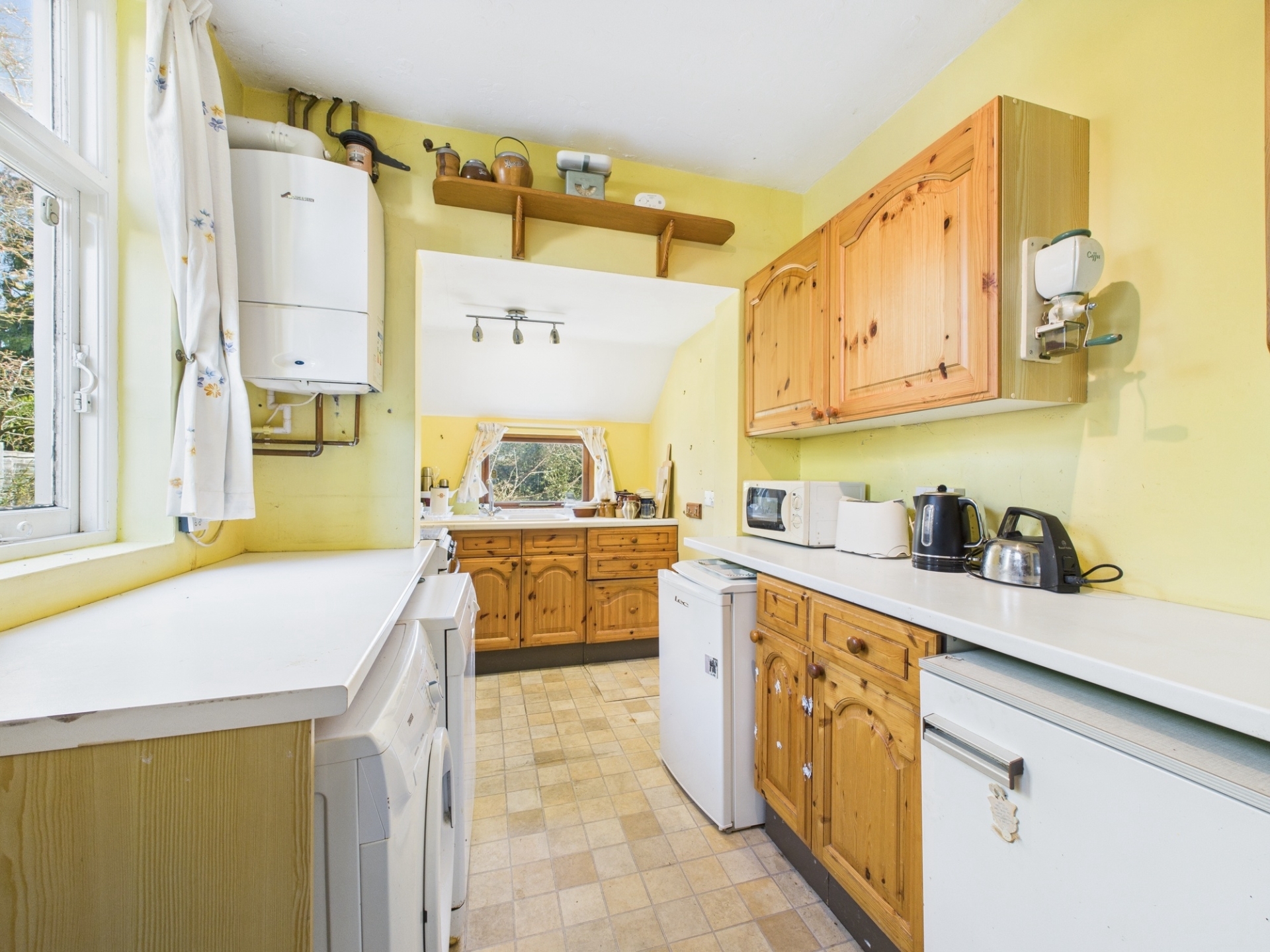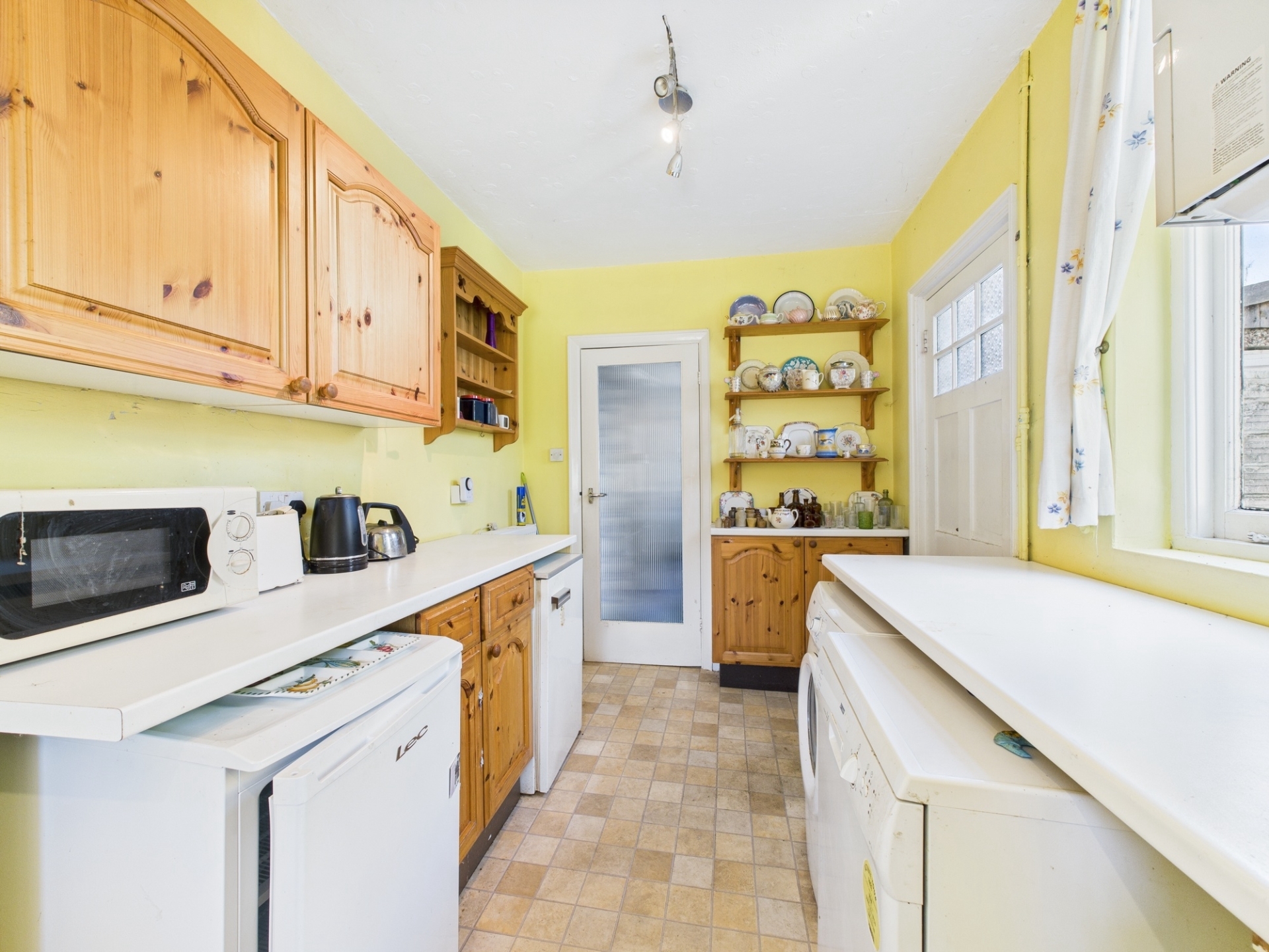 Window to side and rear elevation. Door to side elevation. Extended kitchen which include wall mounted and base units with work surface over. One and a half bowl sink and drainer. Space for washing machine, tumble dryer, oven, fridge and freezer. Modern heating system.