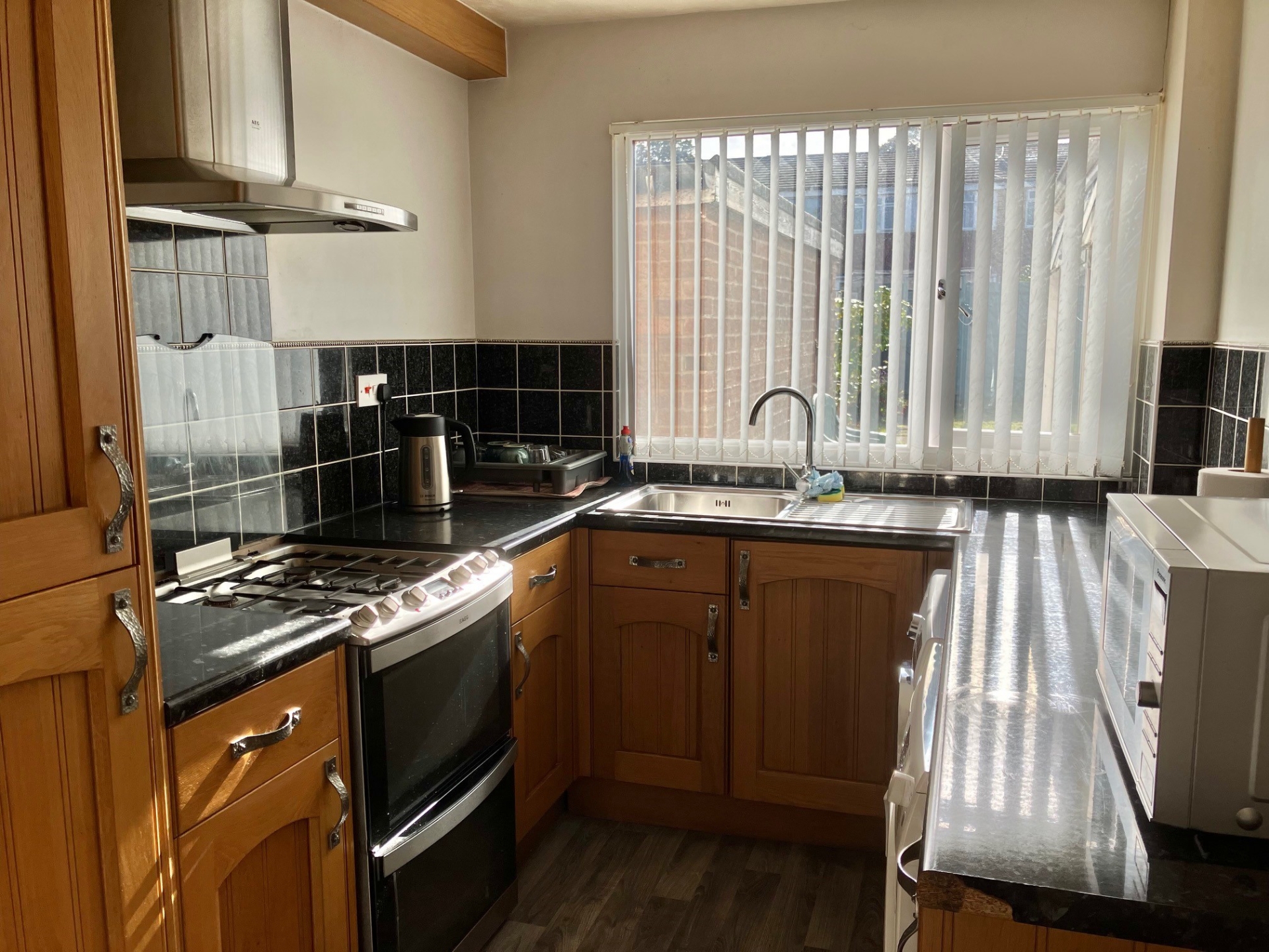Luxury vinyl flooring. Double glazed window to rear elevation Understairs cupboard. A range of wall and base level units with roll top work surfaces over. Tiled splashbacks. Stainless steel sink and drainer with hot and cold mixer tap over. Built in fridge freezer. Electric oven and gas hob with extractor fan over. Space for white goods.