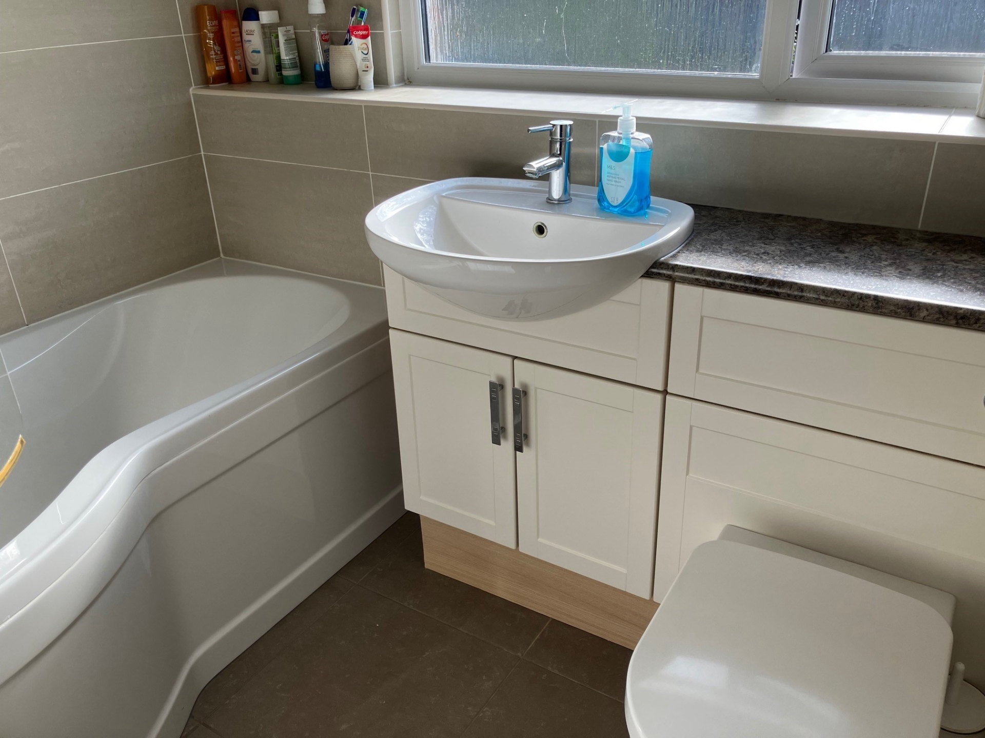 Obscure double glazed window to rear elevation. Three piece suite. 'P' shaped panel bath with shower over. Low level WC and pedestal wash hand basin in bespoke cupboard with hot and colder mixer tap over. Ceramictiled floor and fully tiled.