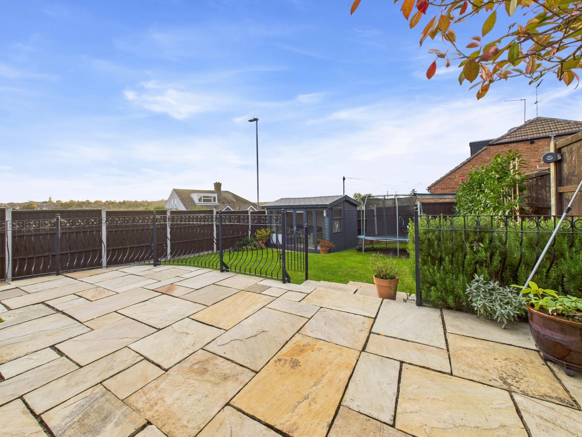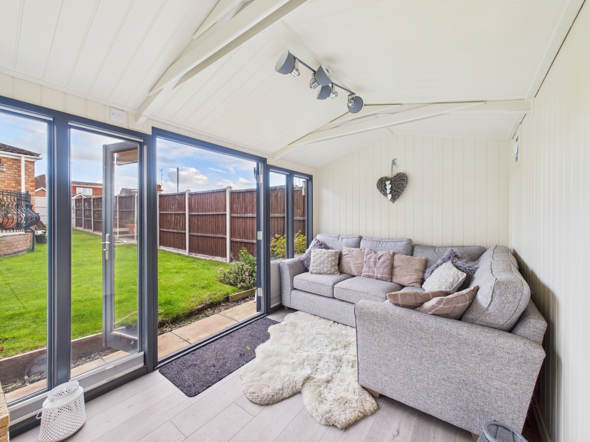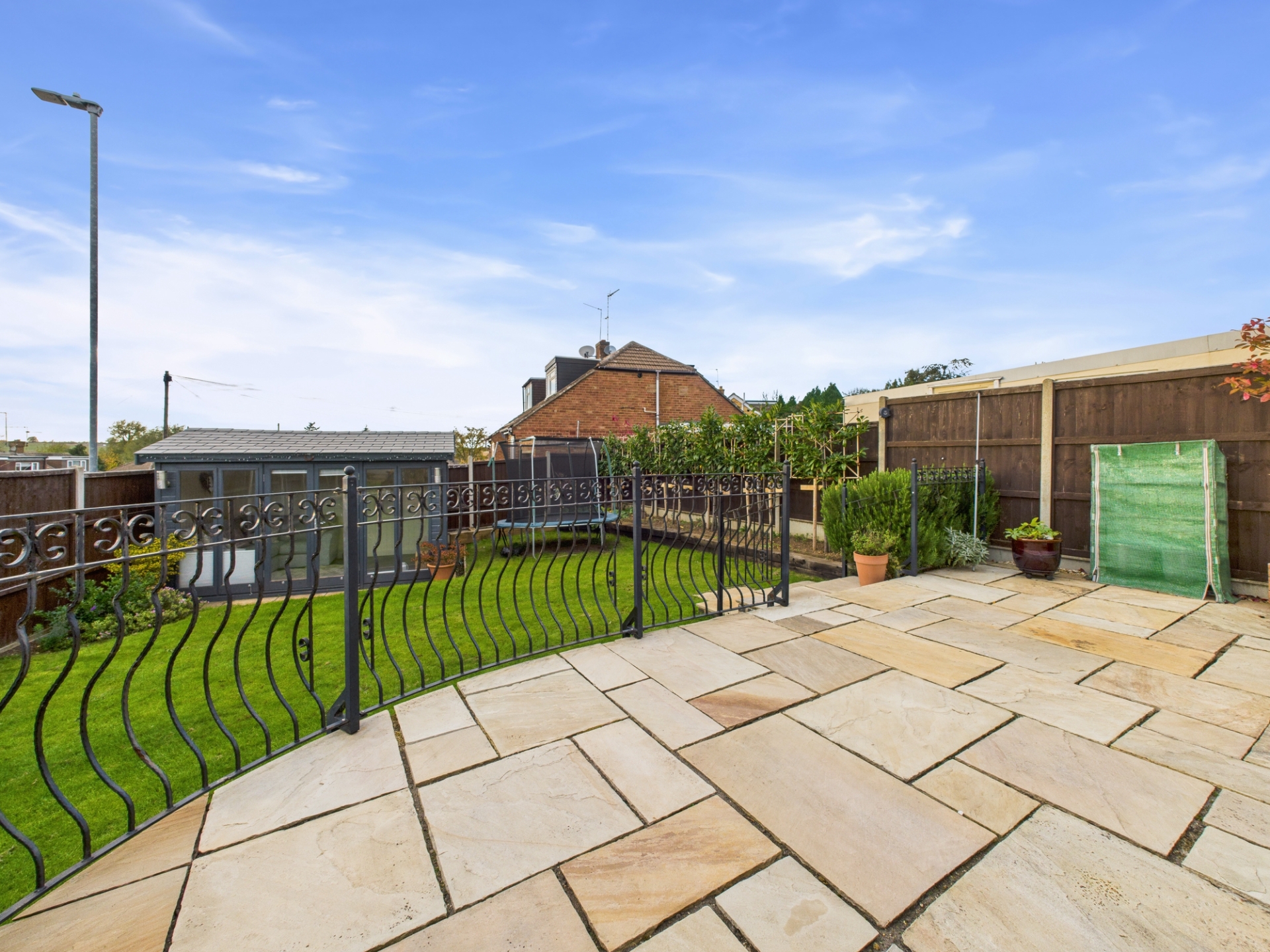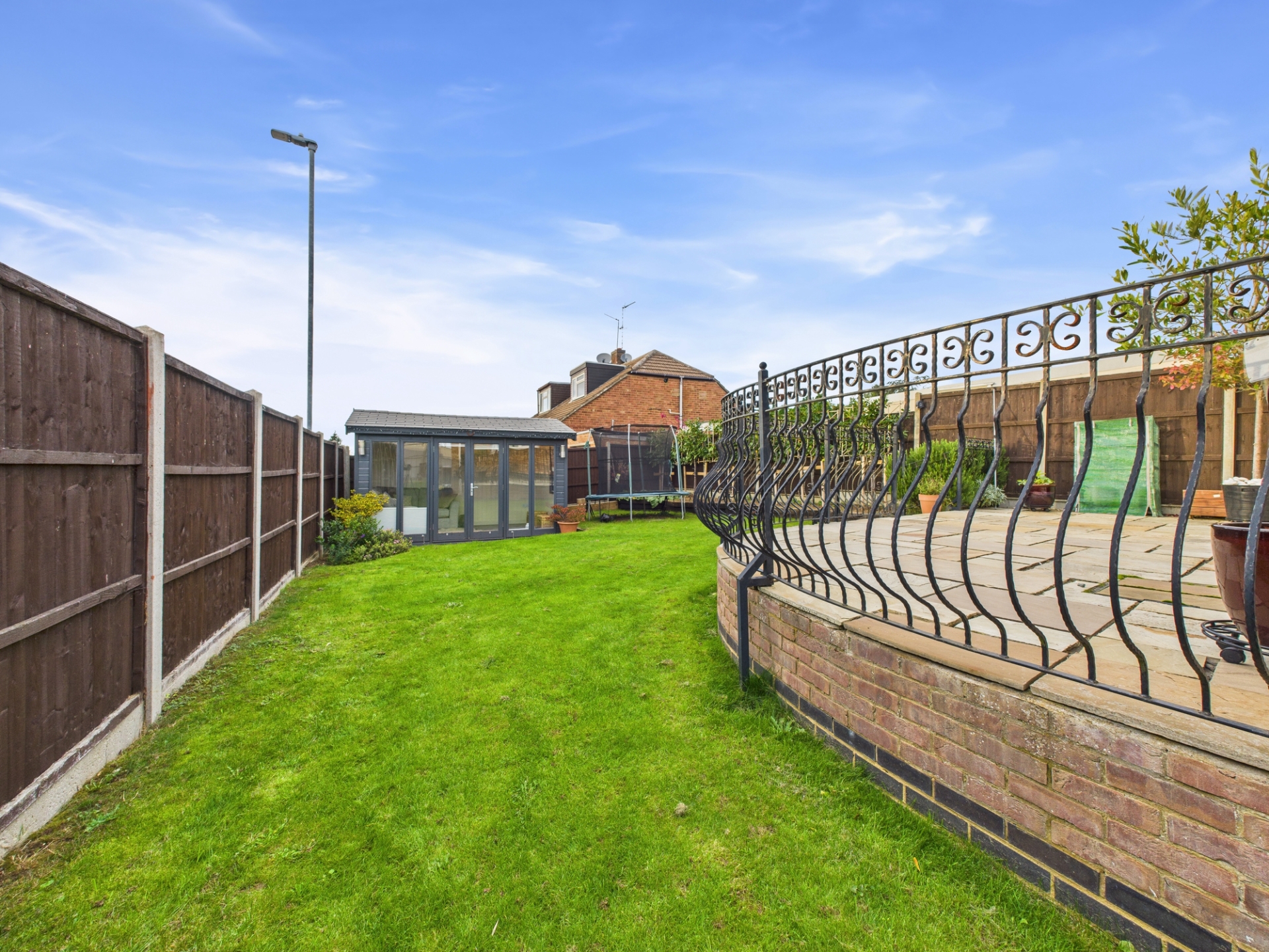 Raised patio area with case iron railings. Timber garden room. Laid to lawn. Raised beds. Side access. Fully enclosed by timber fencing.