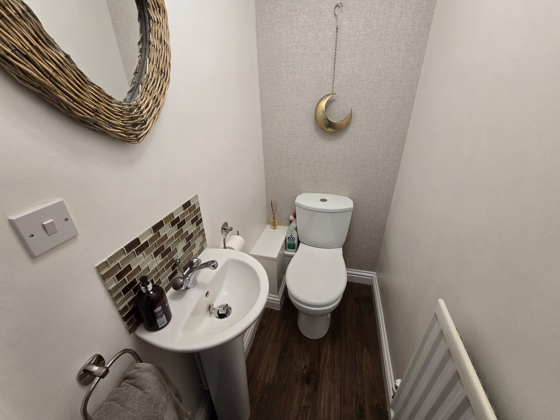Radiator. Wood effect flooring. Pedestal sink unit with tiled splash backs. Low level WC.