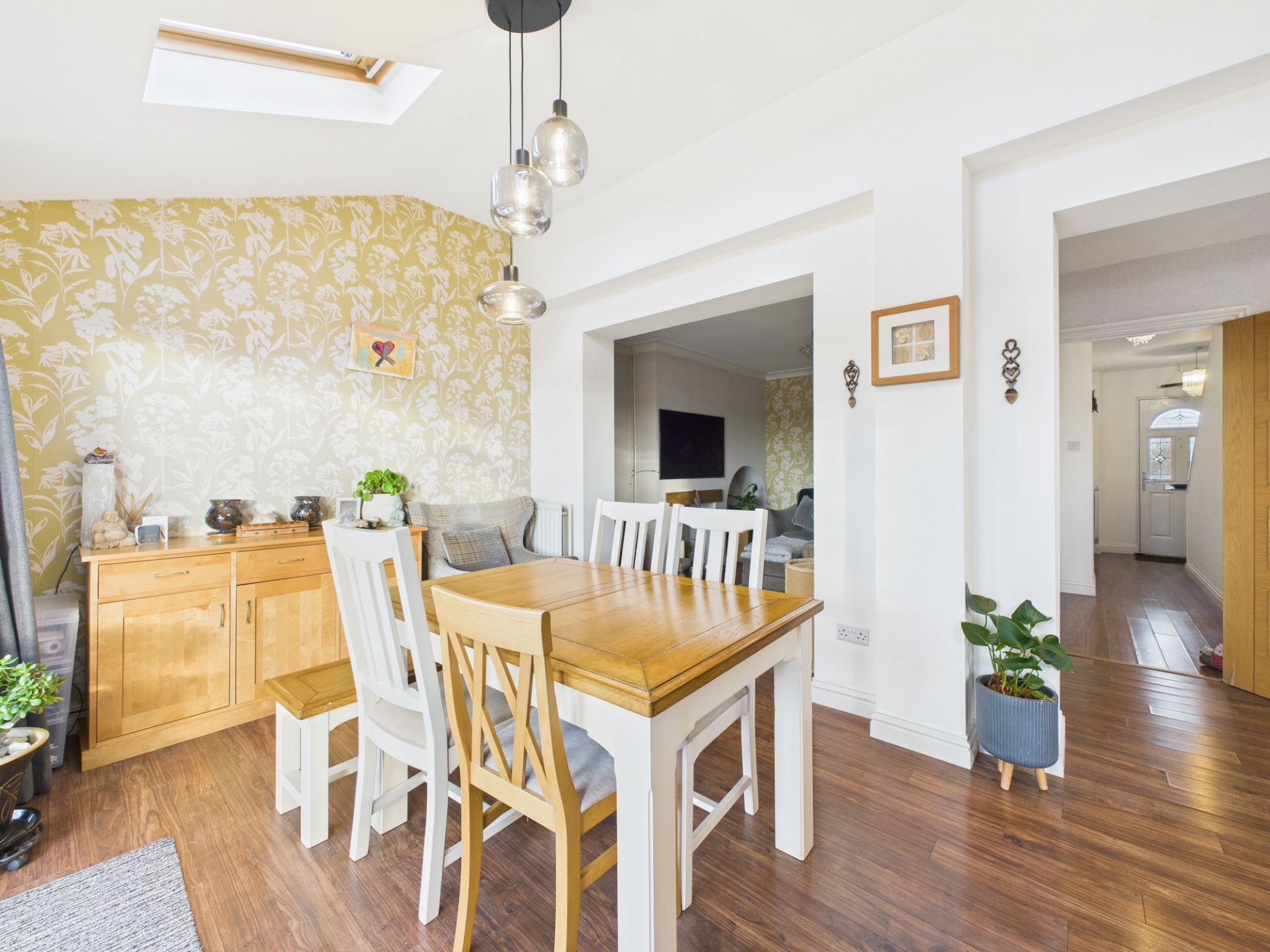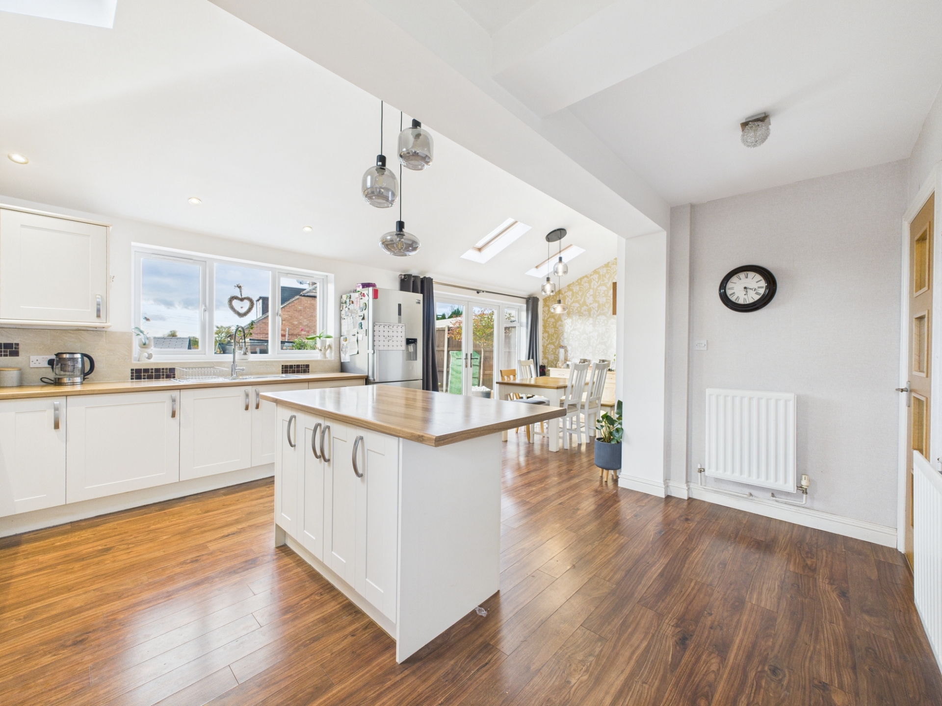 uPVC double glazed window and French door to rear elevation. Velux windows. Two radiators. Base and wall mounted units. Gas hob and double oven. Stainless steel one and a half sink with drainer. Spaces for fridge freezer, washing machine and tumble dryer. Tiled splashbacks. Wood effect flooring.