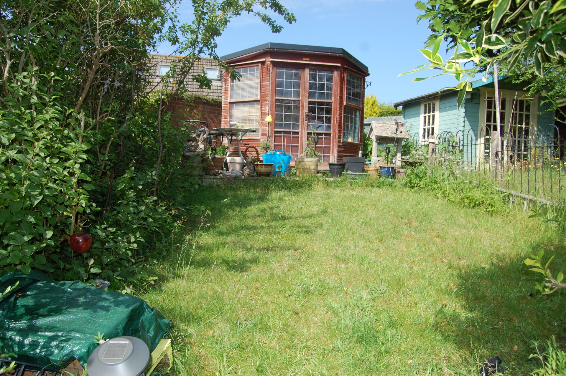 Courtyard with steps upto the lawn with established borders, patio and summer house.