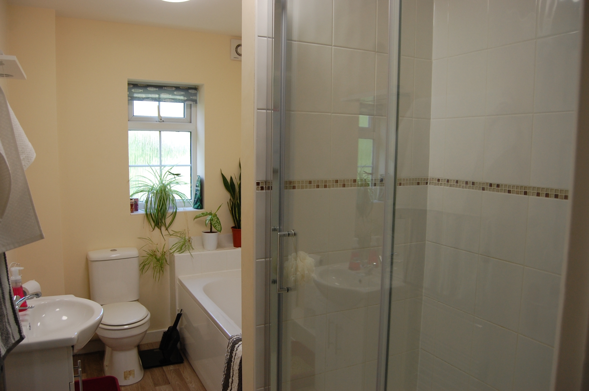 Window to rear elevation. Chrome heated towel rail. Suite comprising bath, shower in a large tiled cubicle, WC and wash hand basin with storage below.