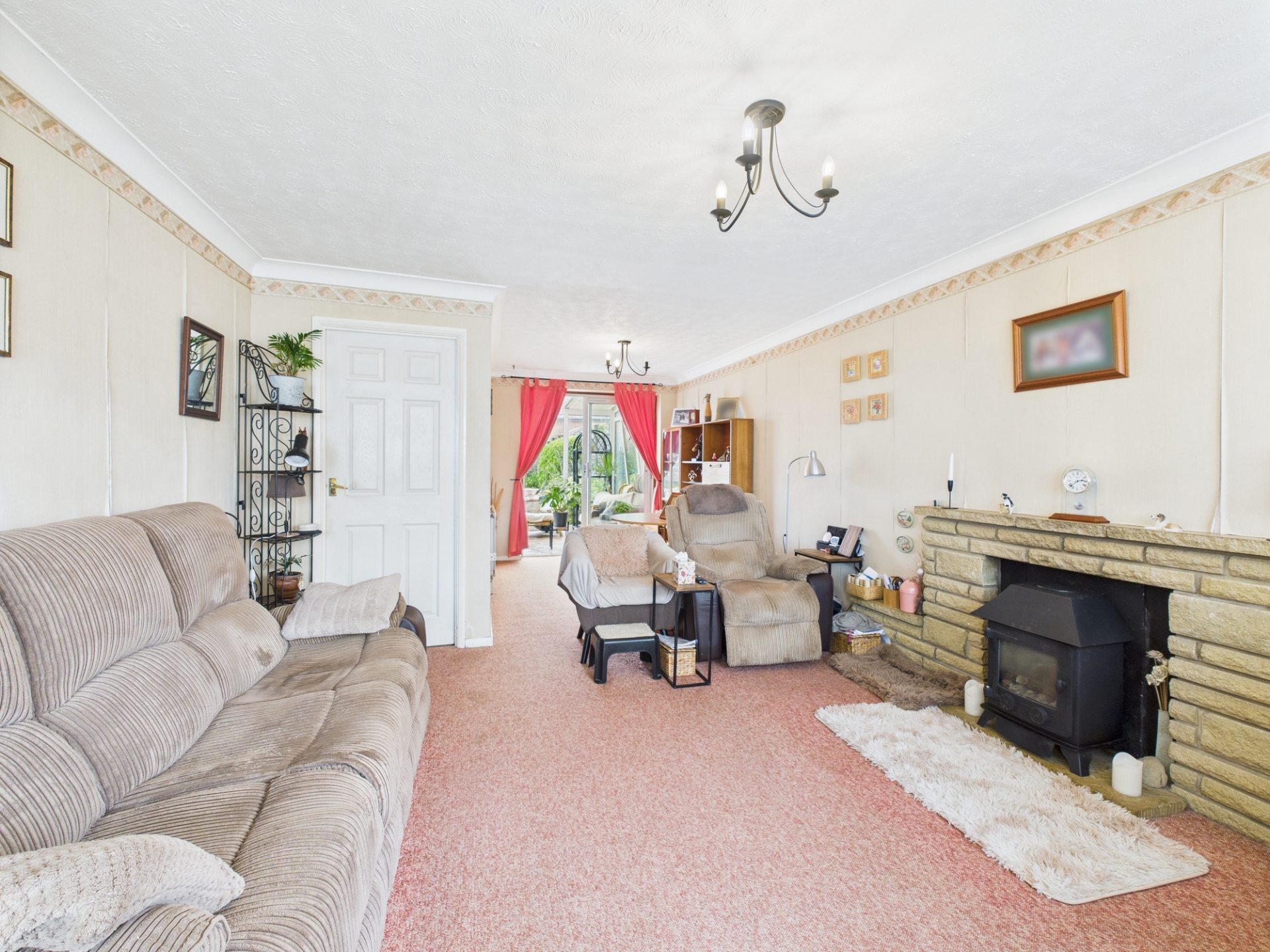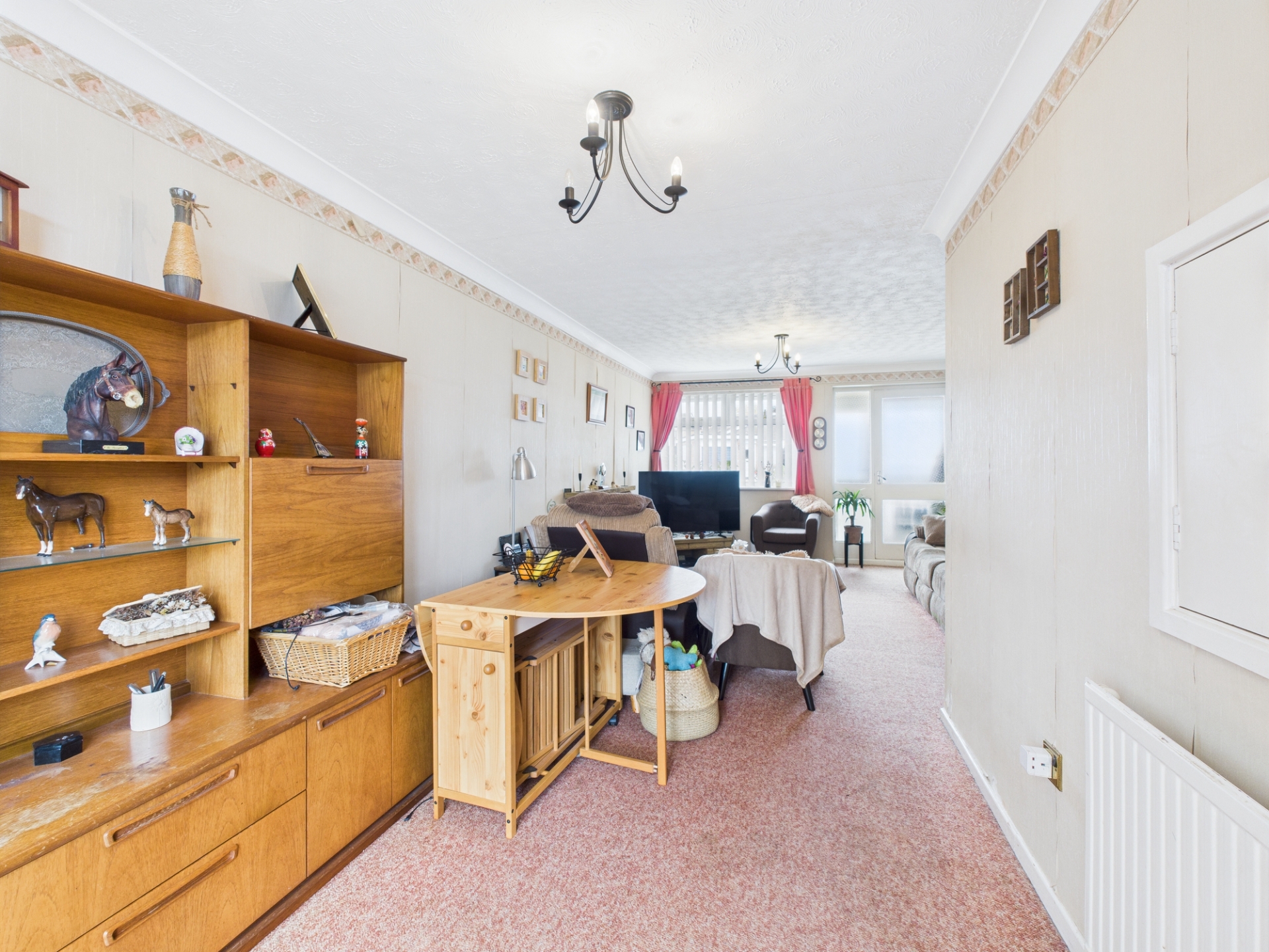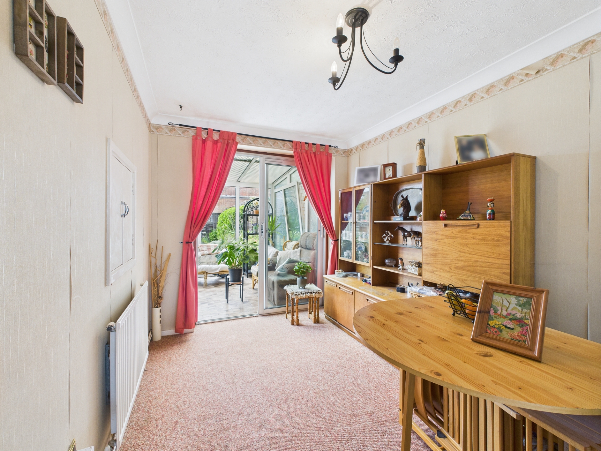 uPVC double glazed window to front elevation. Cast iron gas fireplace with brick surround. Radiator. Aluminium sliding door to conservatory. Serving hatch.