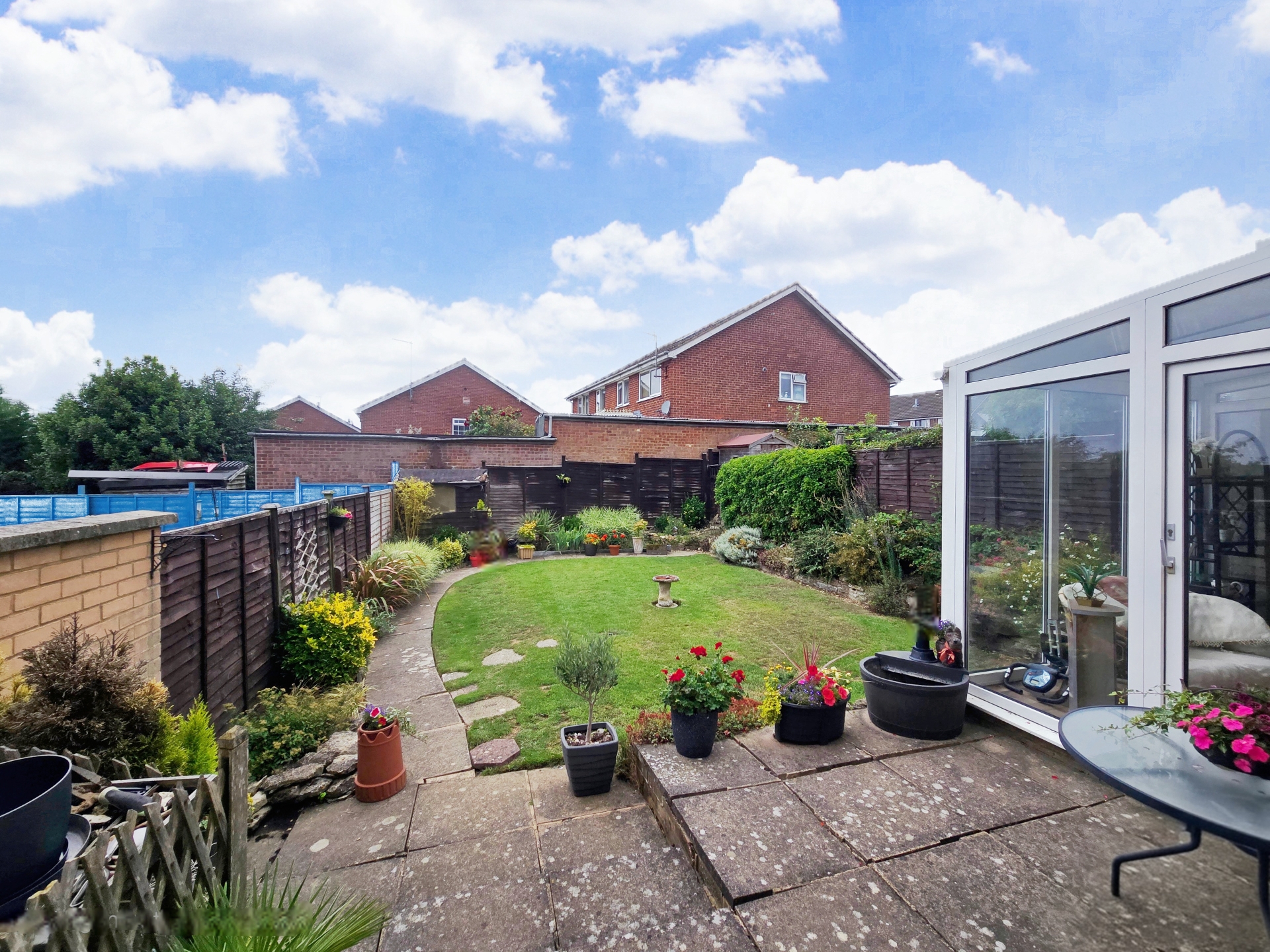 Enclosed by timber fencing. Mainly laid to lawn. Raised filled flower borders.