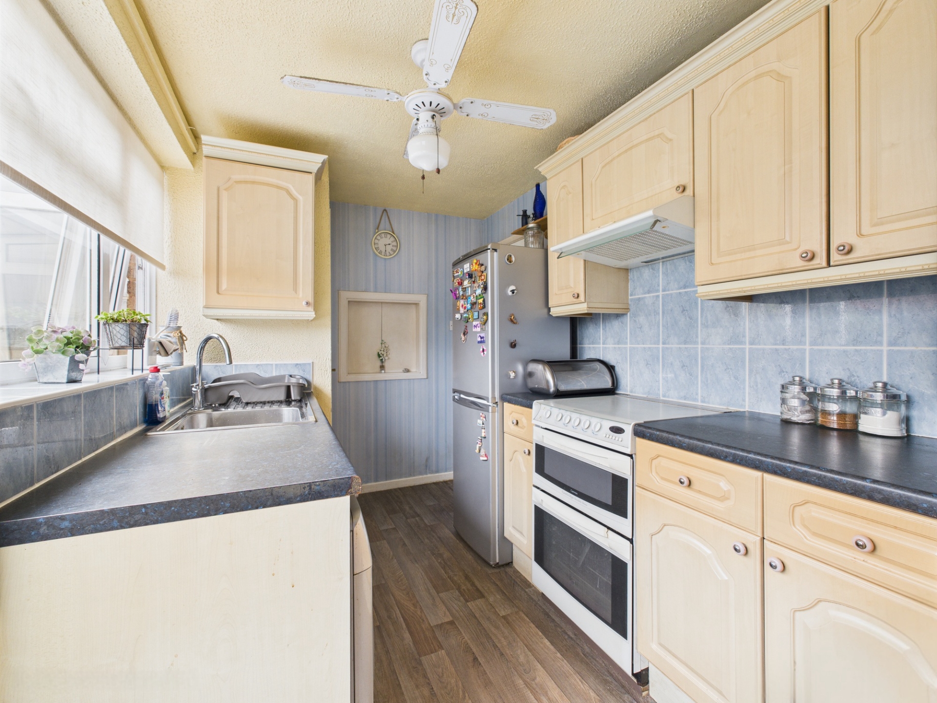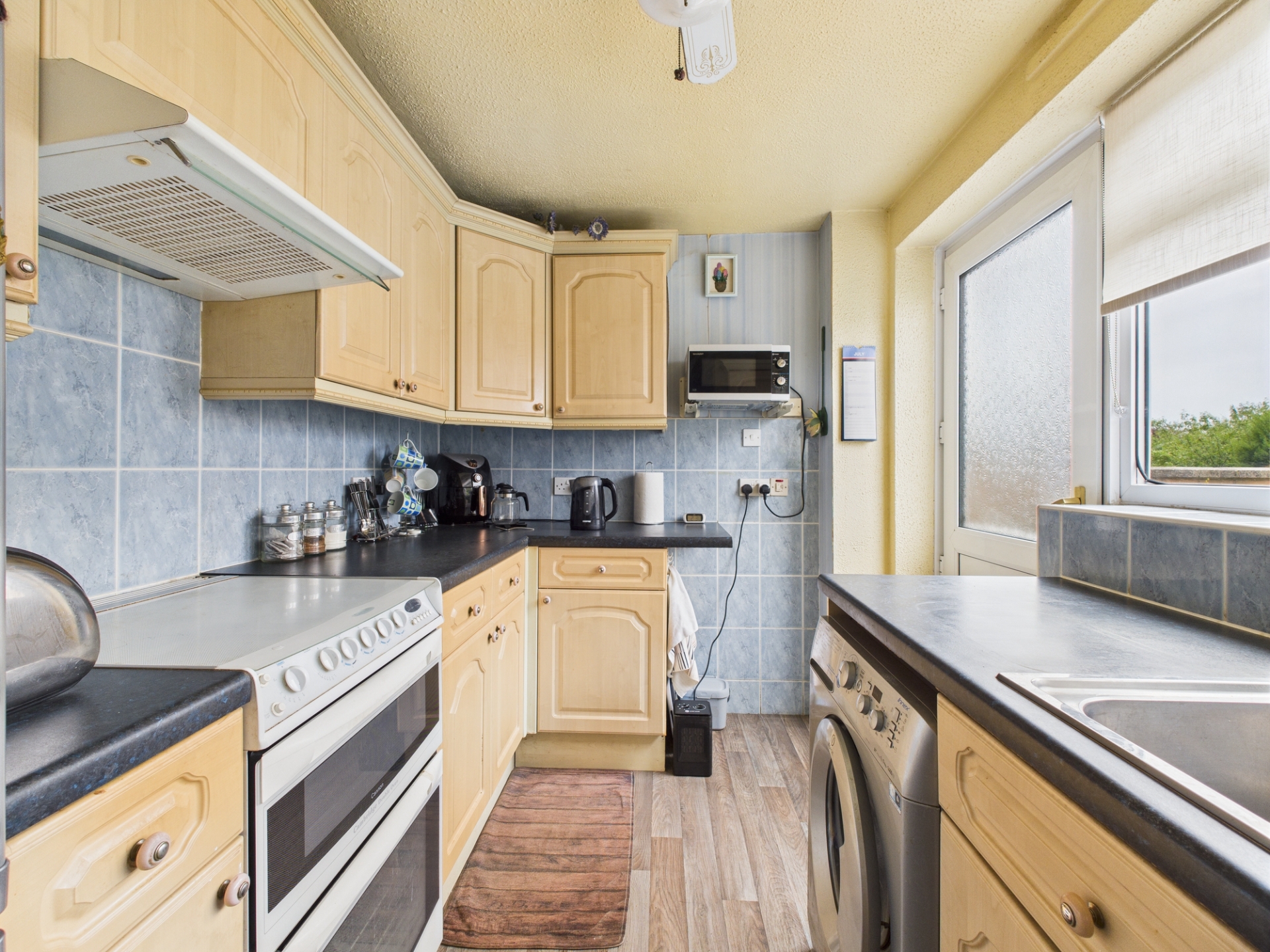 uPVC double glazed window to rear elevation. uPVC obscure glazed door to rear elevation into garden. Range of wall mounted and base level units with roll top work surface over. Stainless steel sink and drainer. Space for white goods. Cupboard housing boiler.
