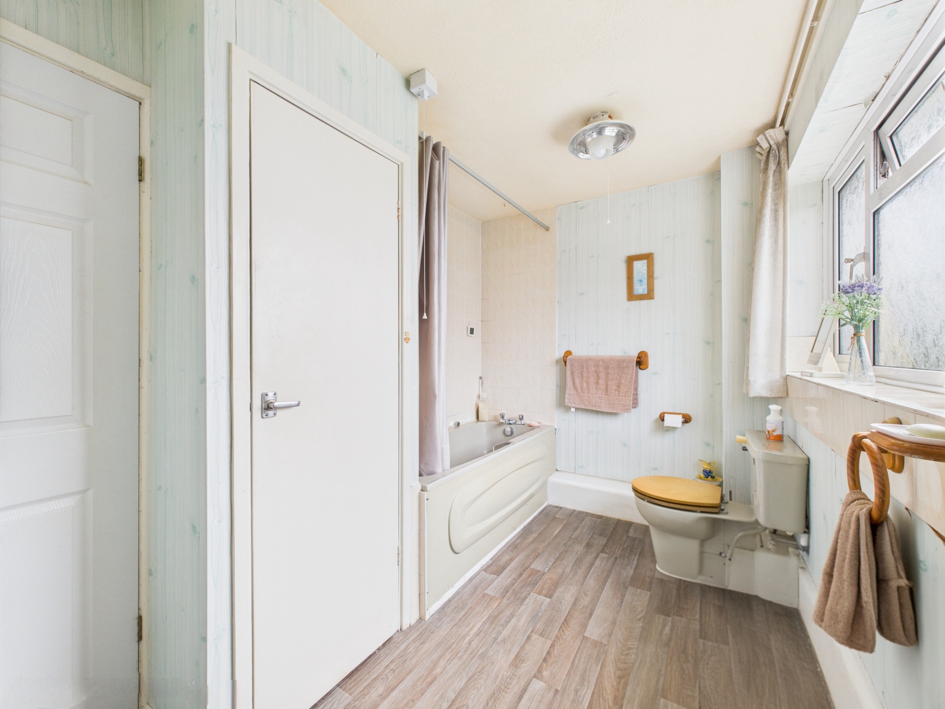 uPVC obscure glazed window to rear elevation. Radiator. Airing cupboard. Three piece suite comprising panel bath with shower over. Low level WC and porcelain hand wash basin.