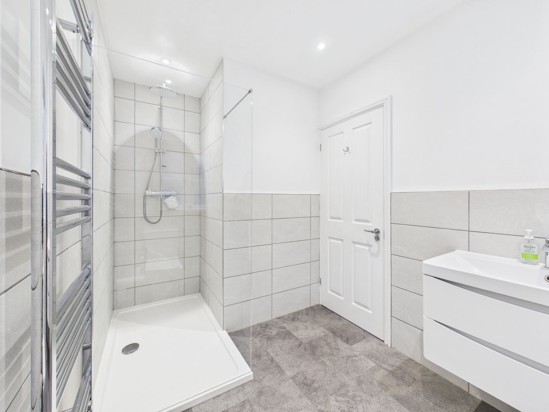 Obscure uPVC double glazed window to side elevation. Walk in shower. Low level WC. Wash hand basin in vanity unit. Heated towel rail. Spotlights.
