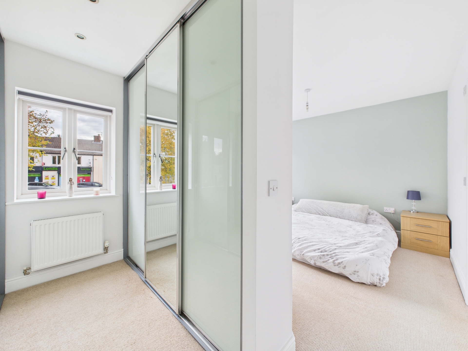 uPVC double glazed window to front elevation. Radiator. Dressing area with two fitted wardrobes with sliding doors. Spotlights to ceiling. Access to en-suite