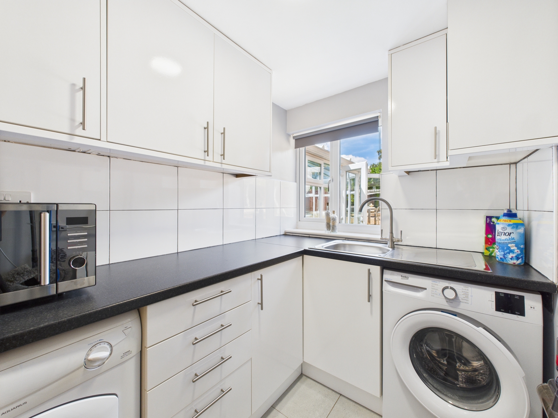 Plumbing for washing machine and tumble dryer. Wall mounted and base level cupboards, uPVC window to side elevation.