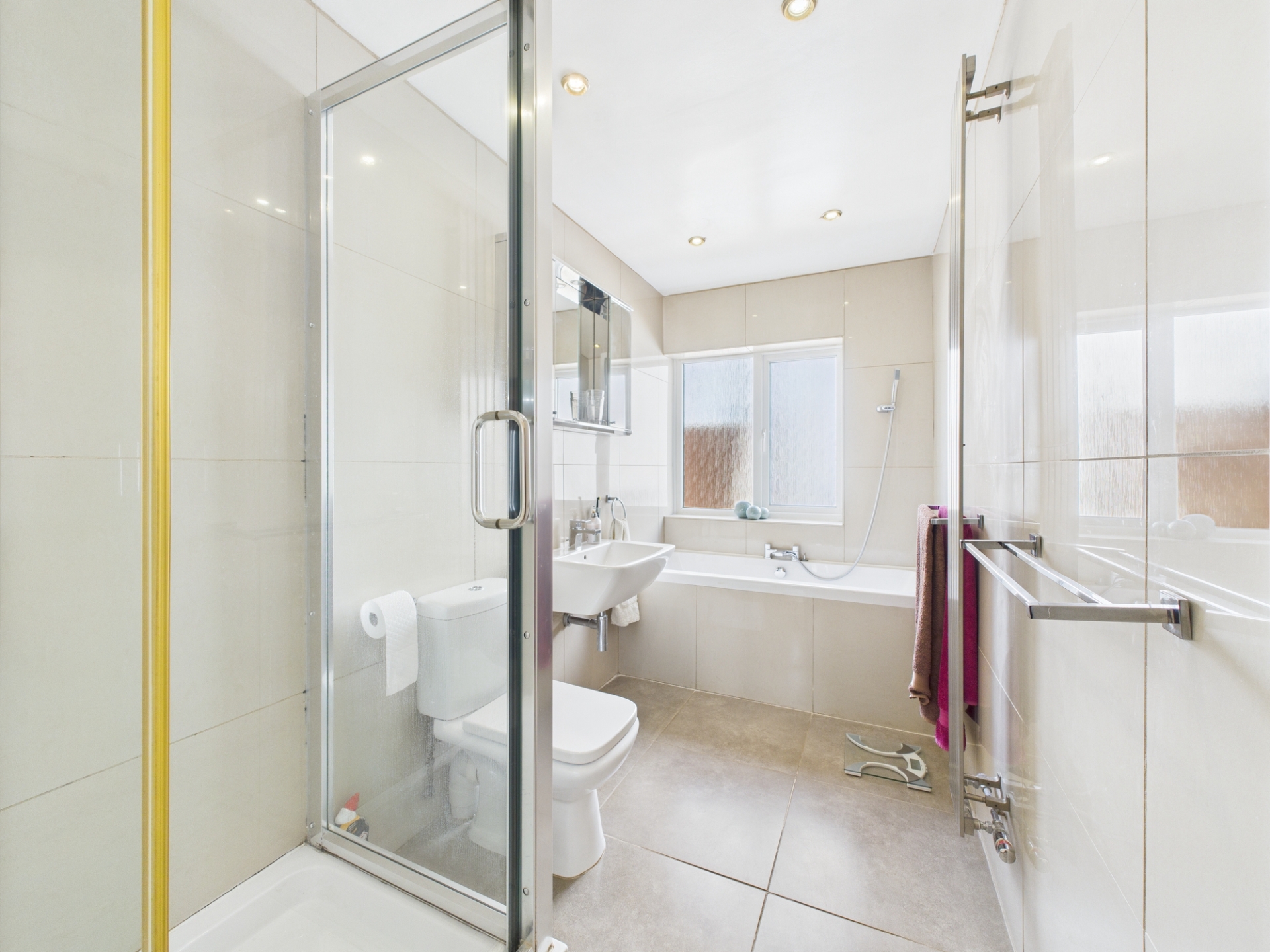 Obscure uPVC double glazed window to side elevation. Shower cubicle. Radiator. Low level WC. Pedestal wash hand basin. Panel bath with mixer tap and shower attachment.