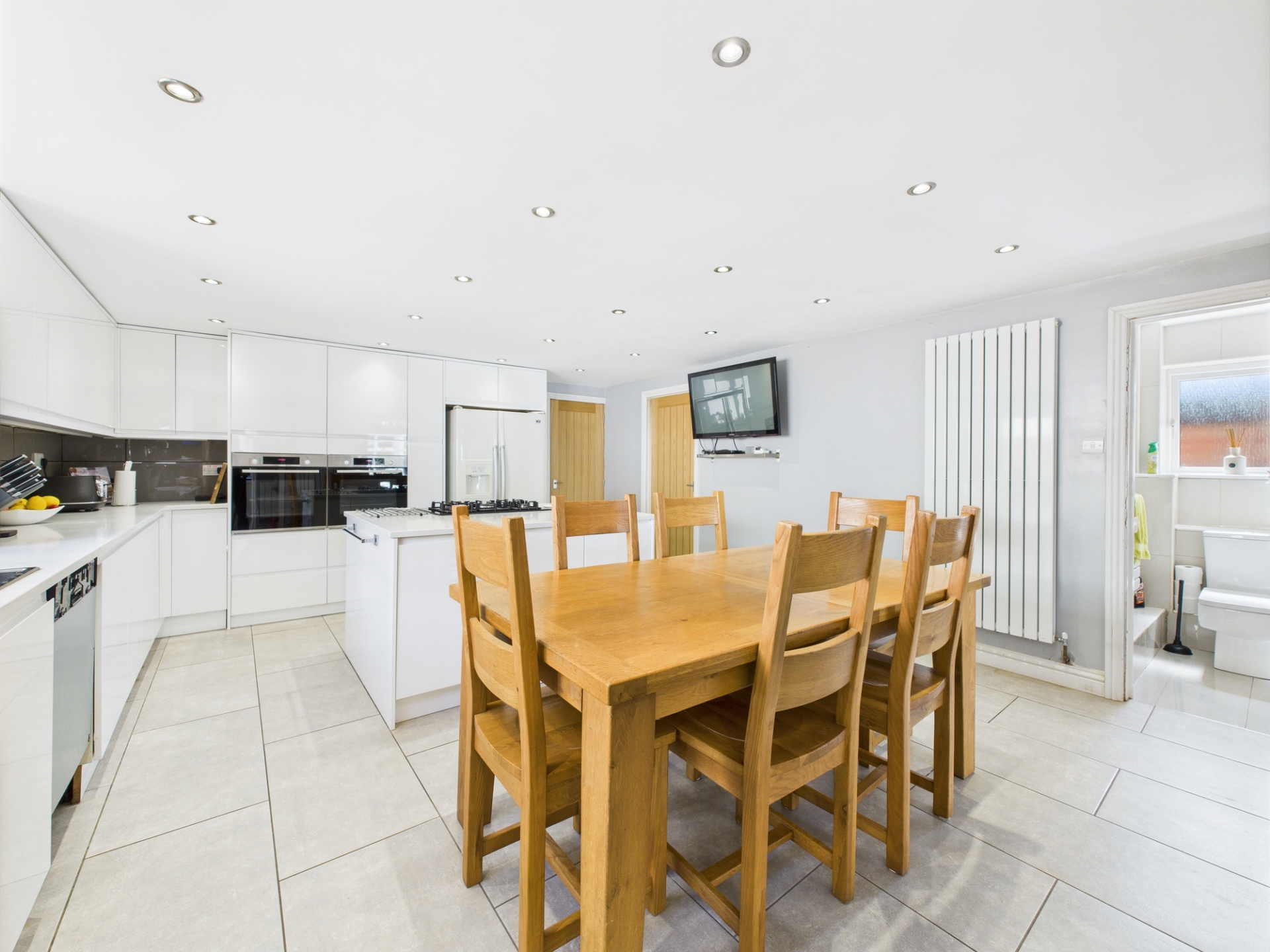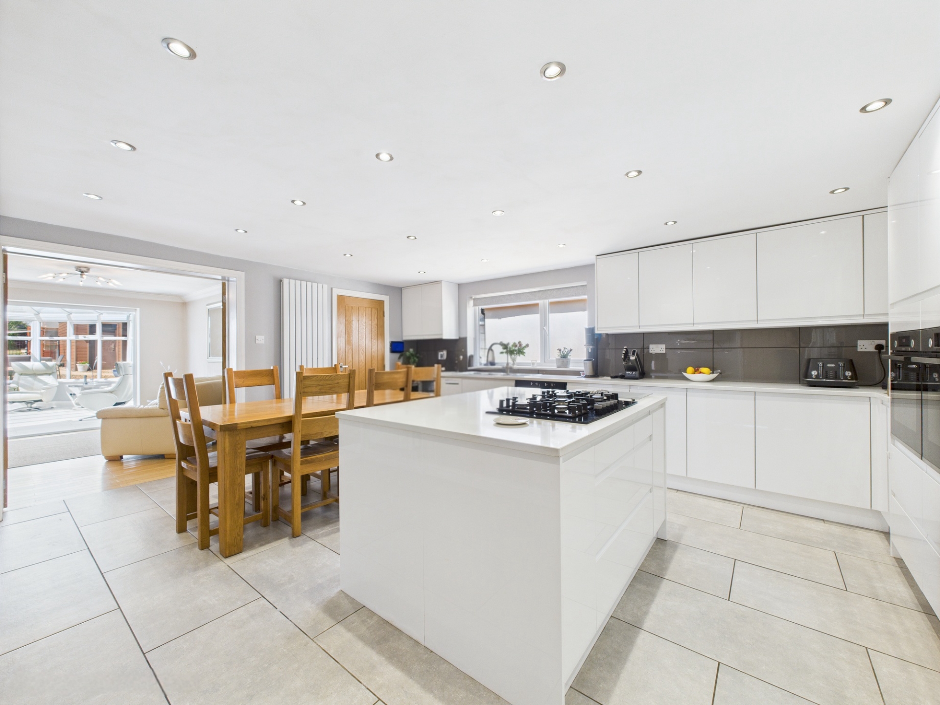 uPVC double glaze window to side elevation. A range of wall mounted and base level cupboards and drawers with roll top work surface over. Five ring hob in island. Twin built in ovens side by side. Access to utility room, WC, lounge and office.