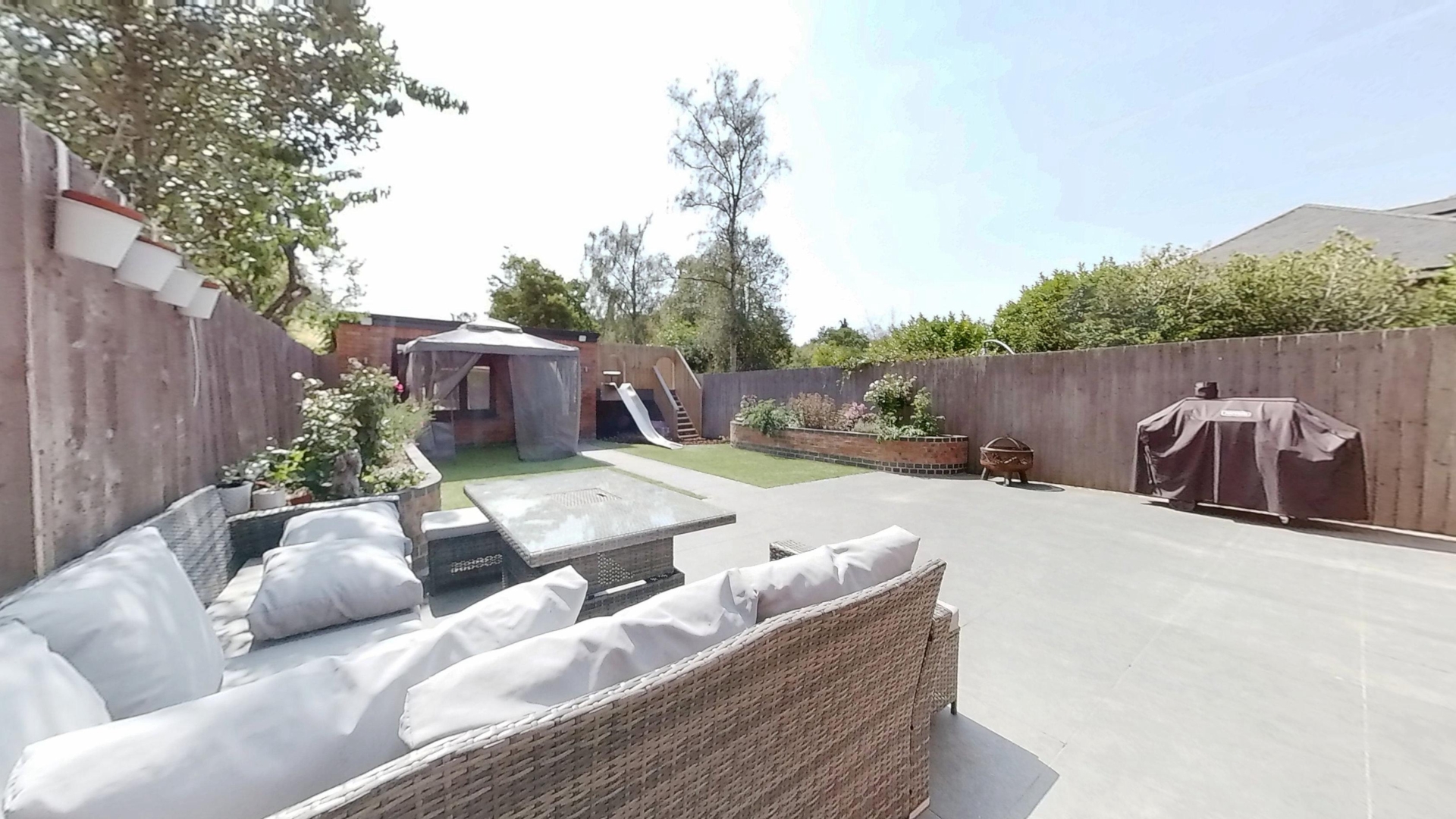 Patio area (porcelain slabs) with path leading to garden room. Artificial lawn. Play area for children.