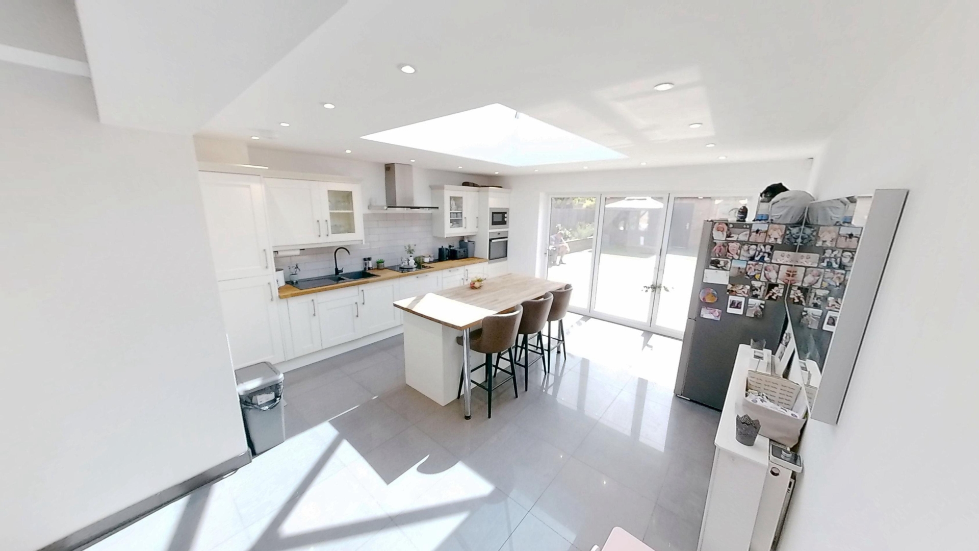 Aluminium bi-folding doors to garden area. Radiator. Wall mounted and base units with island in the centre. Roof lantern. Integrated dishwasher, oven, microwave and induction hob. Sink with mixer tap.