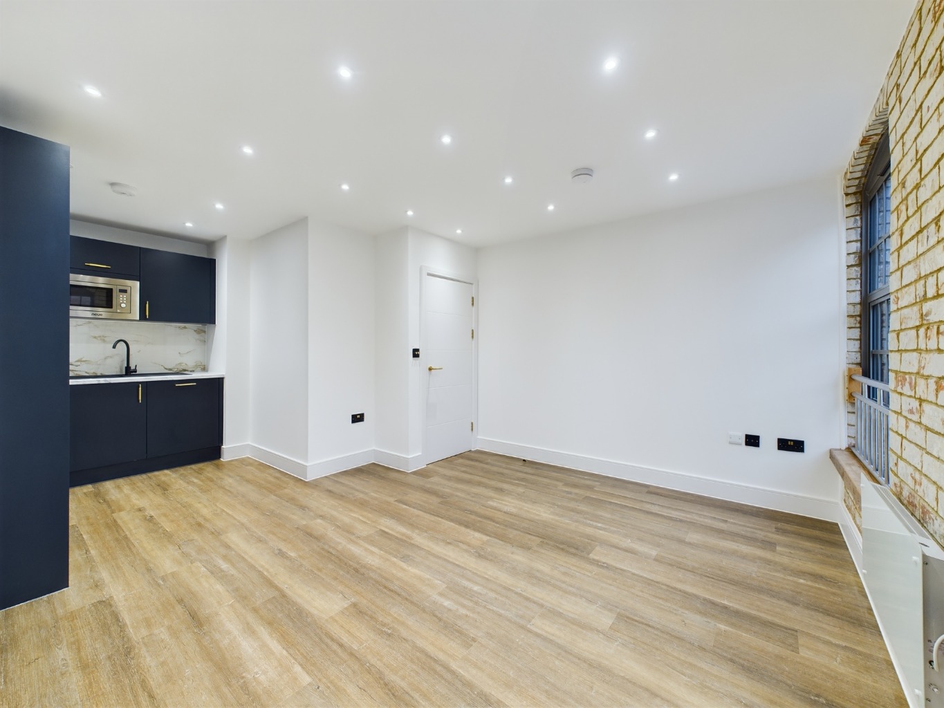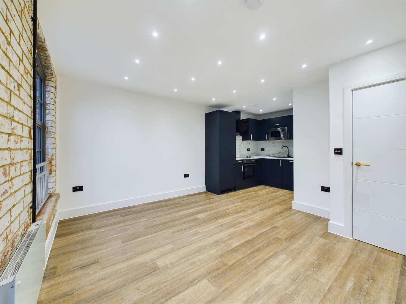 Living Area: Two factory style double glazed windows. Wall mounted electric heater. Wood effect laminate flooring. Exposed brickwork.