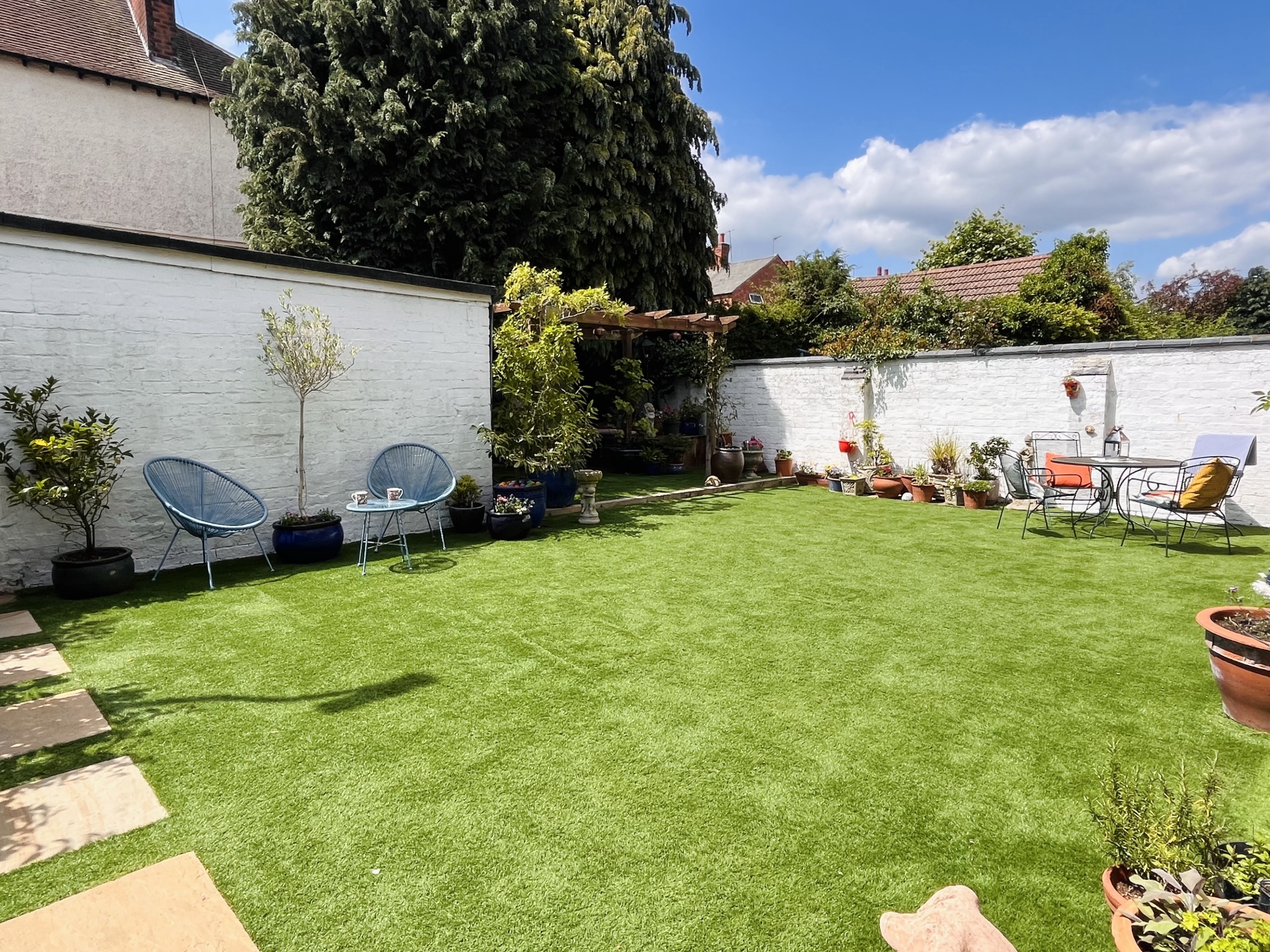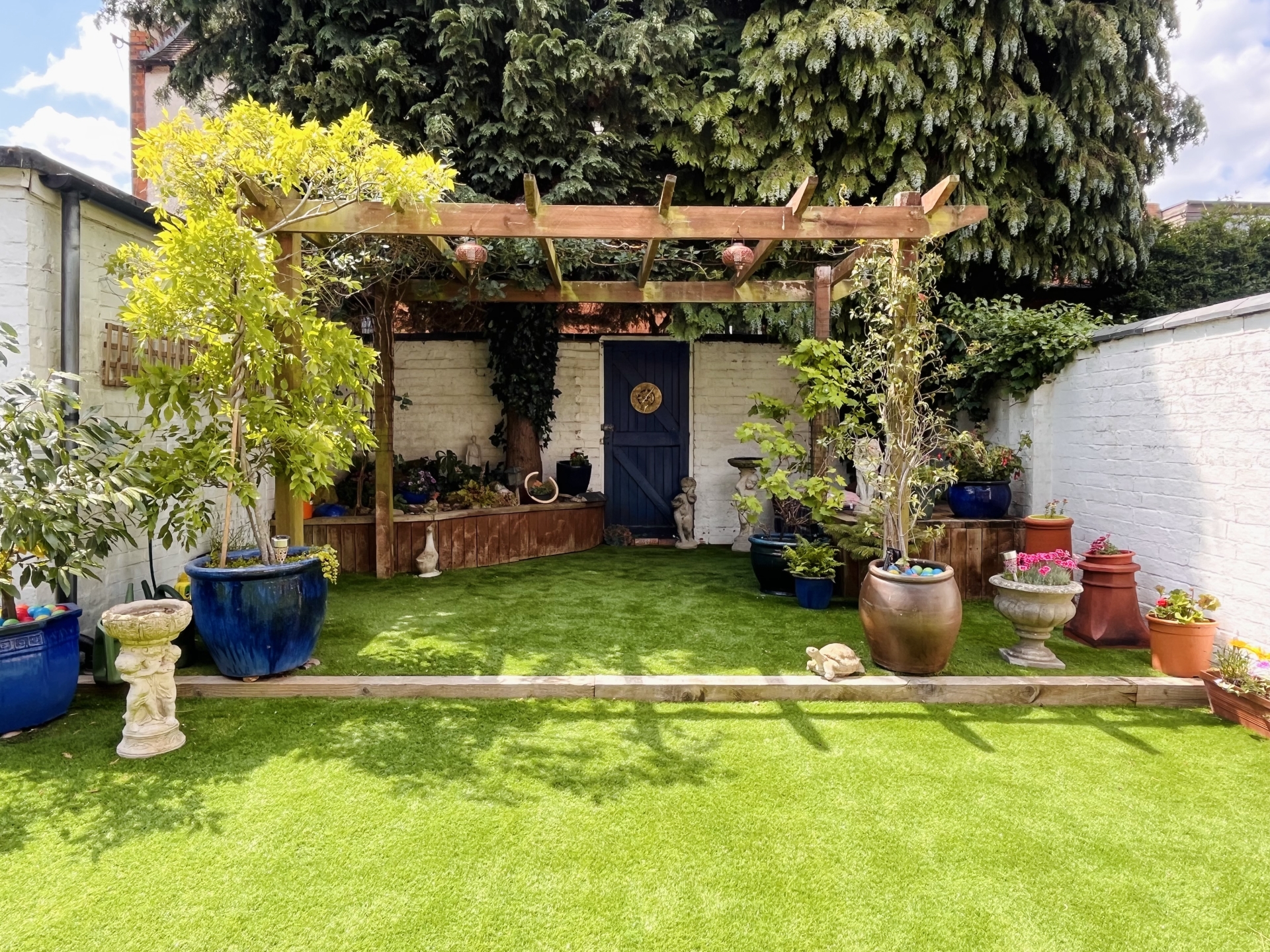 To the front is a small garden with ornate bedding and a central gravel path that leads towards the front door which is under a storm porch. The private and westerly facing rear garden is low maintenance with its artificial grass and slightly raised seating area under a pergola. At the end of the garden is a larger than average garage with electric door.