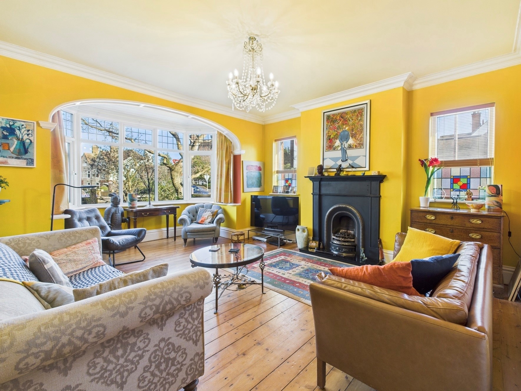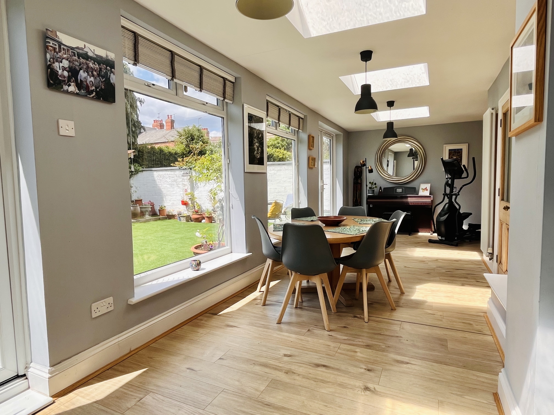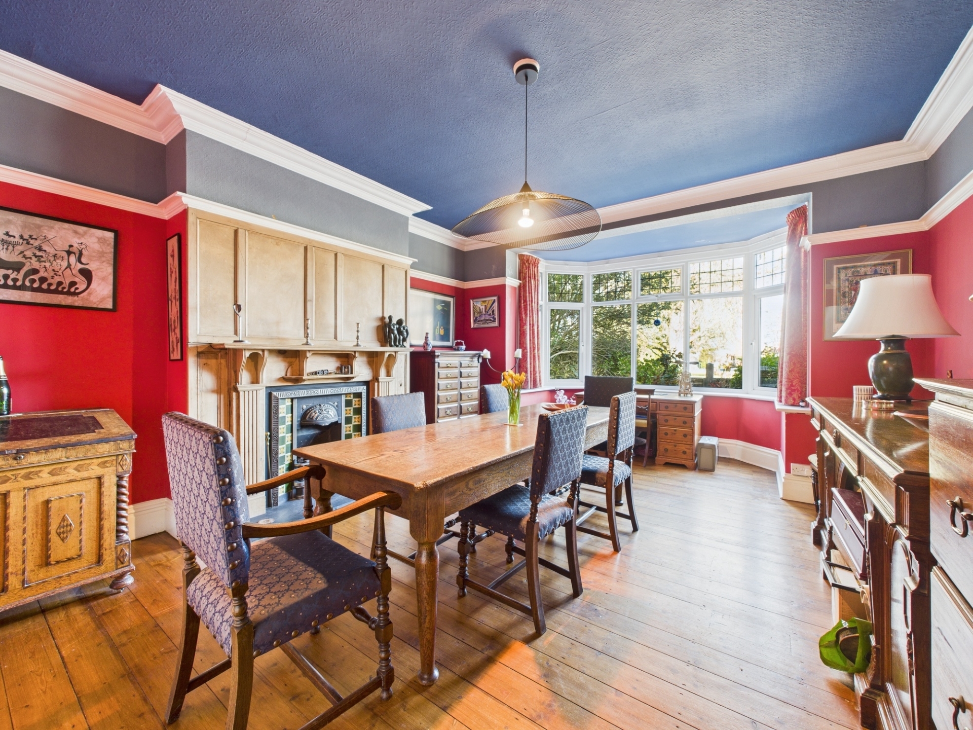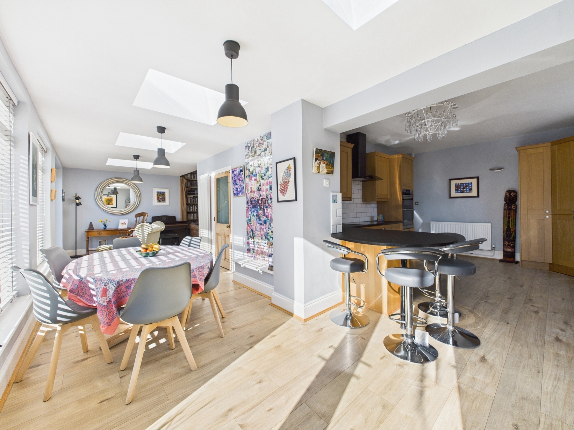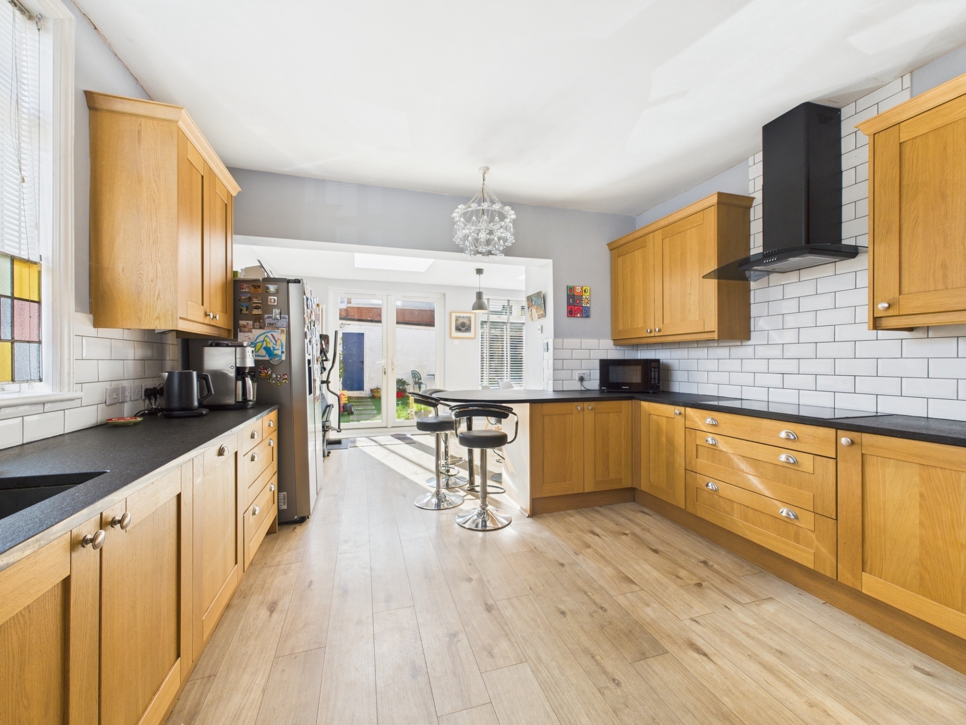 Step through the stained glass double doors and you enter a large hall with high ceilings, ornate coving and a beautiful mosaic floor. To the left is a bright sitting room with a large bay window, exposed wooden floor and a gas coal effect fire. To the right is a large dining room again with bay window, exposed wooden floor and a gas coal effect fire with a lovely wood panel surround. To the rear you will find a large fitted kitchen with breakfast bar which opens onto an airy dining / living space with sky lanterns and numerous windows overlooking the garden. This then wraps around into yet another reception room. Stairs lead down to the cellar which is split into two rooms. The ground floor also benefits from a cloakroom.