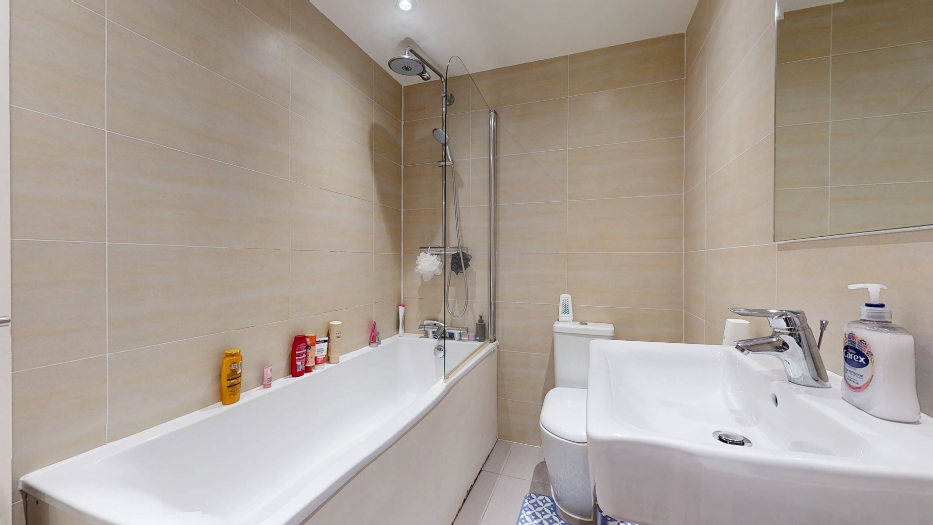 Chrome ladders style radiator. Suite comprising panelled bath, low level WC and wash hand basin. Tiled floor.