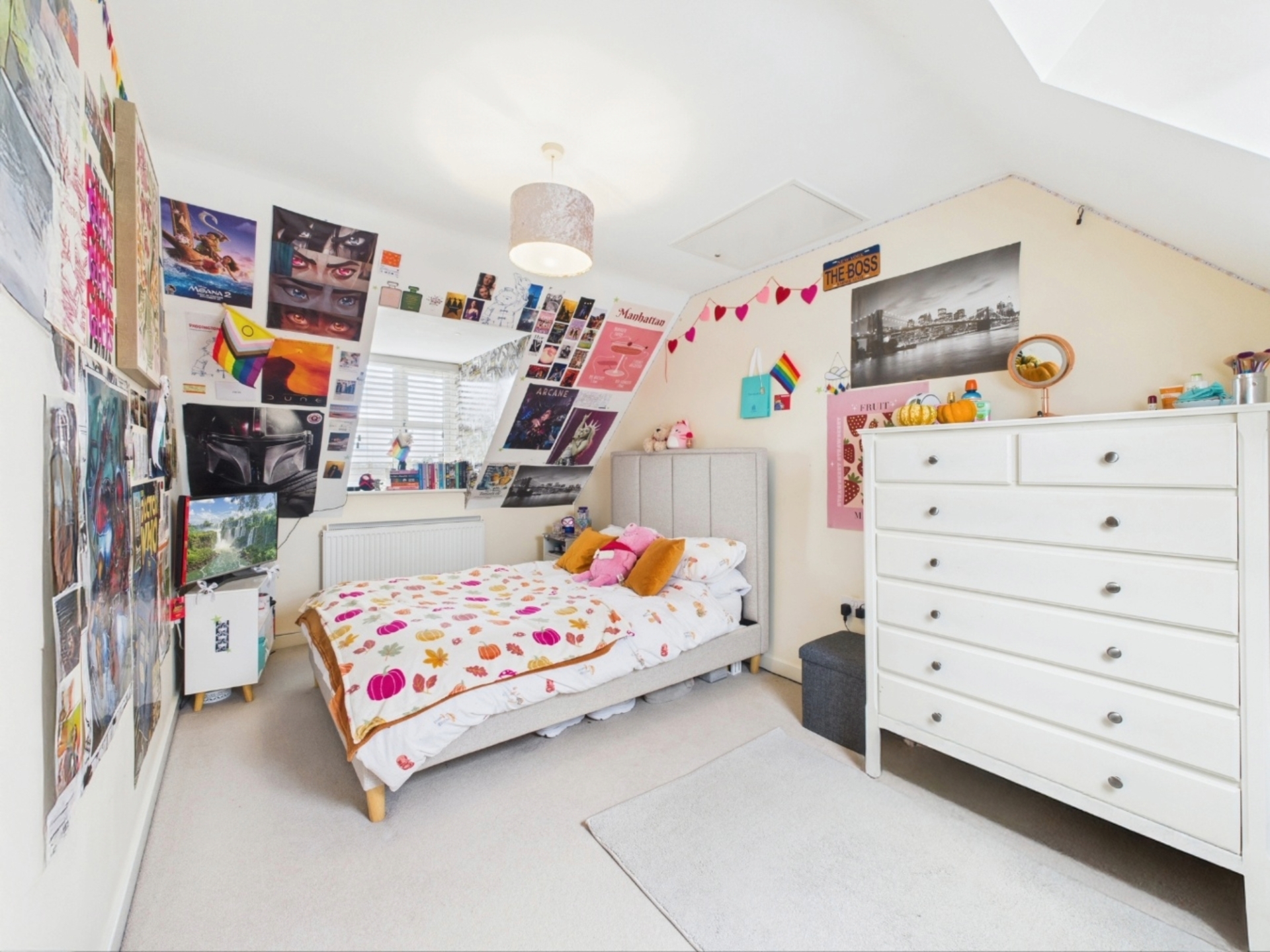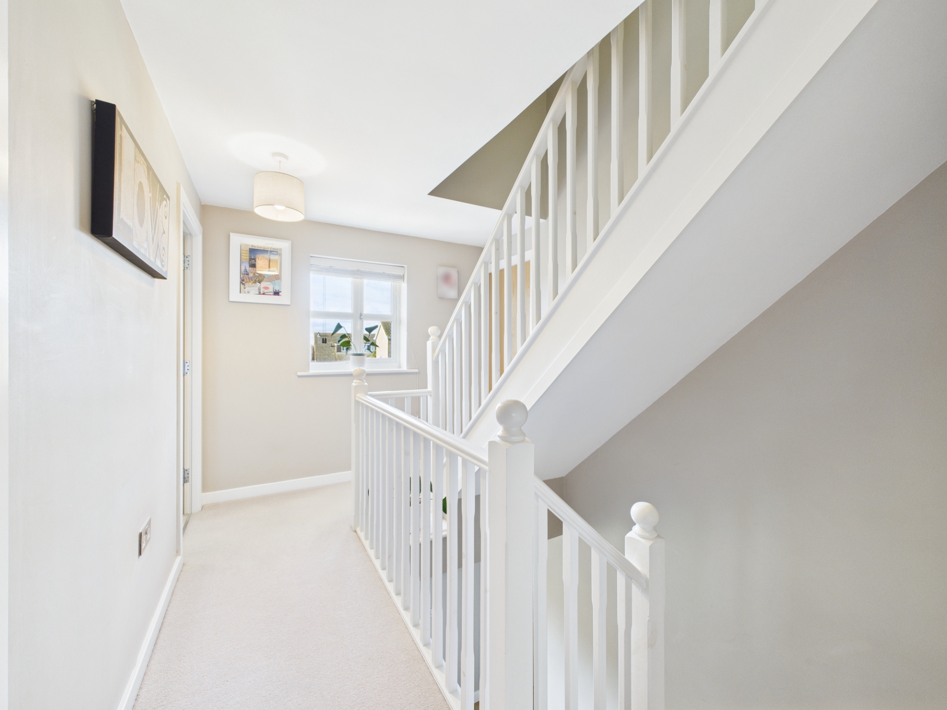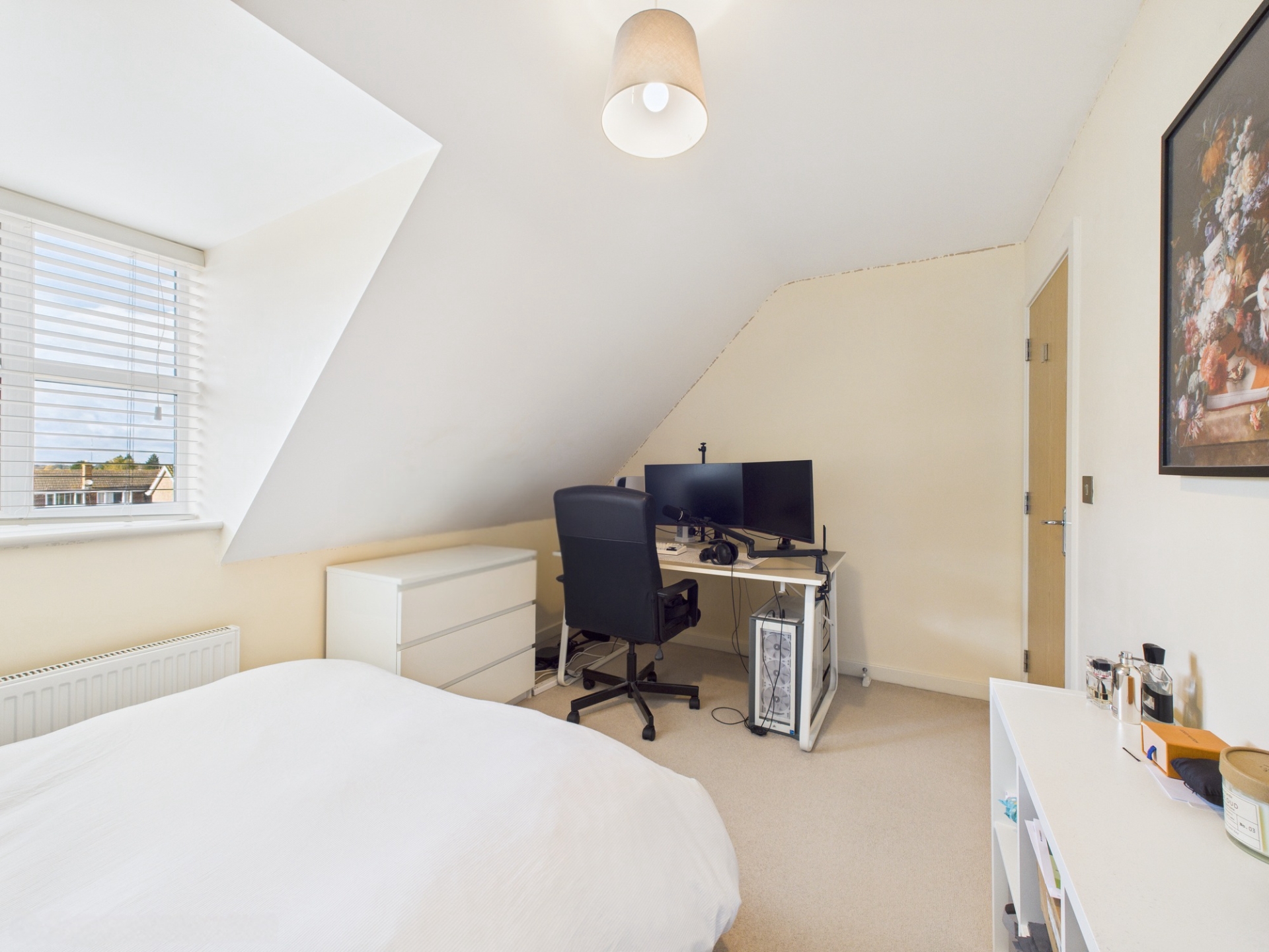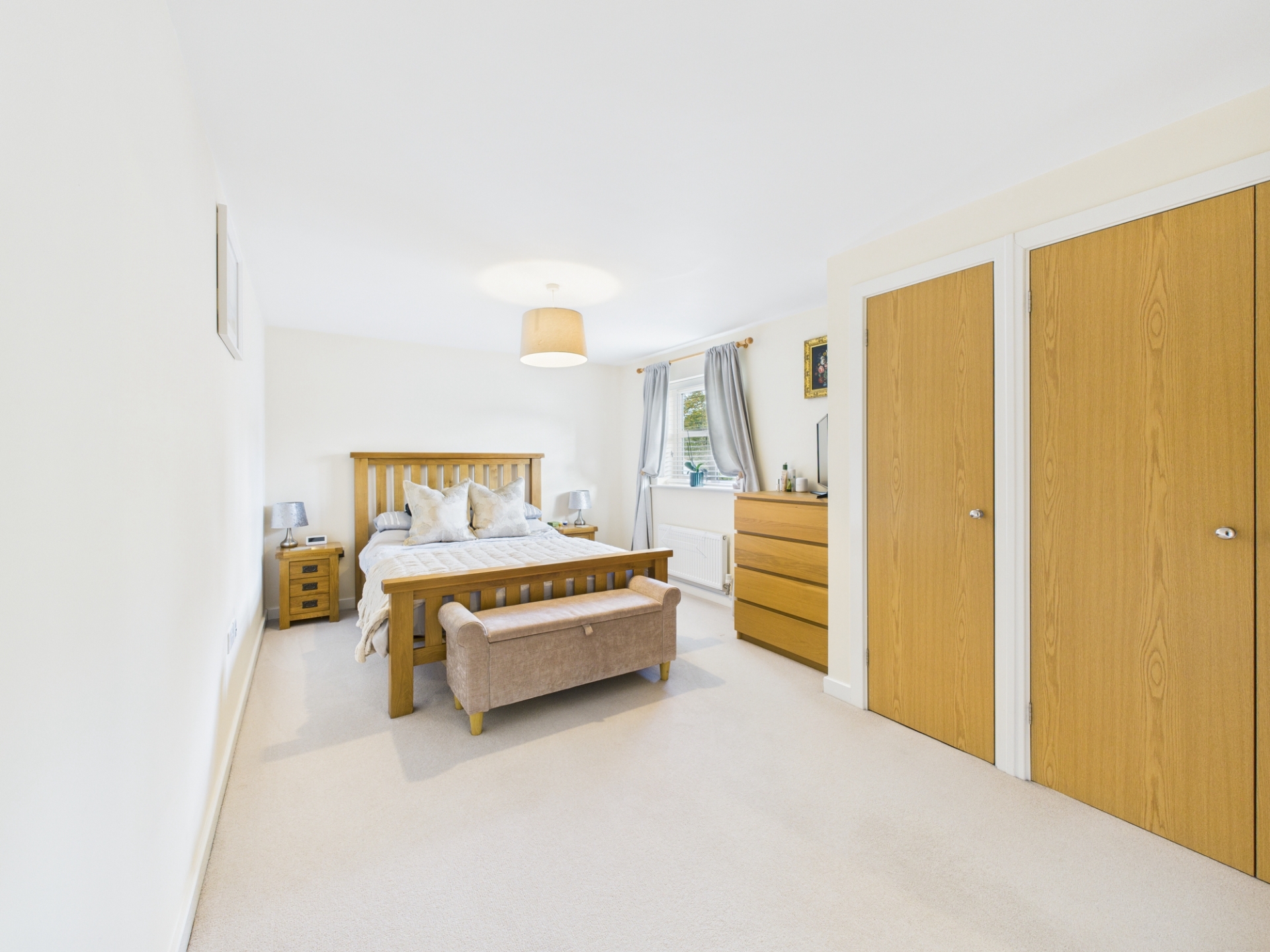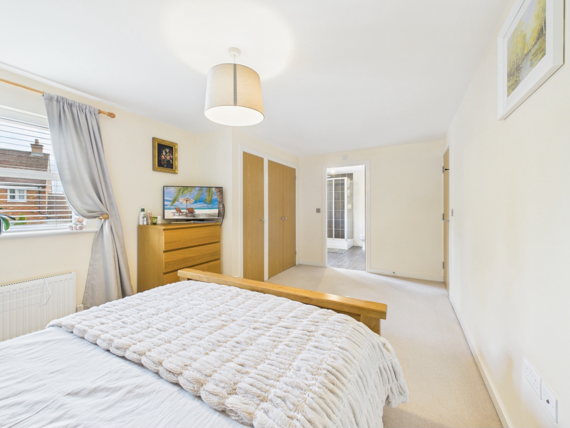 Upstairs, the first-floor landing leads to the spacious principal bedroom, complete with fitted wardrobes and an en suite shower room. Two further double bedrooms and a well-appointed family bathroom complete this level. On the top floor are two additional double bedrooms, both with access to a shared shower room-ideal for teenagers, guests, or a home office setup.
