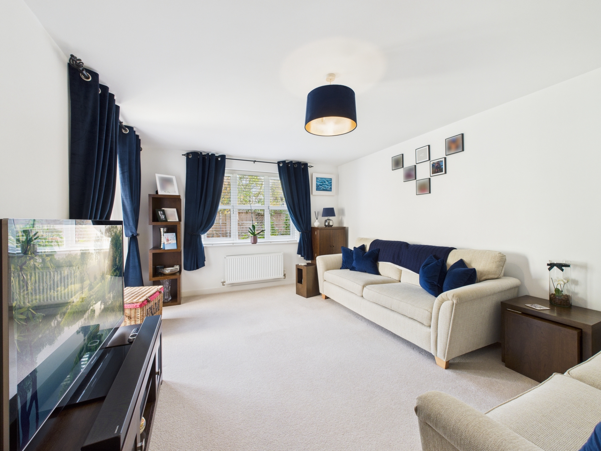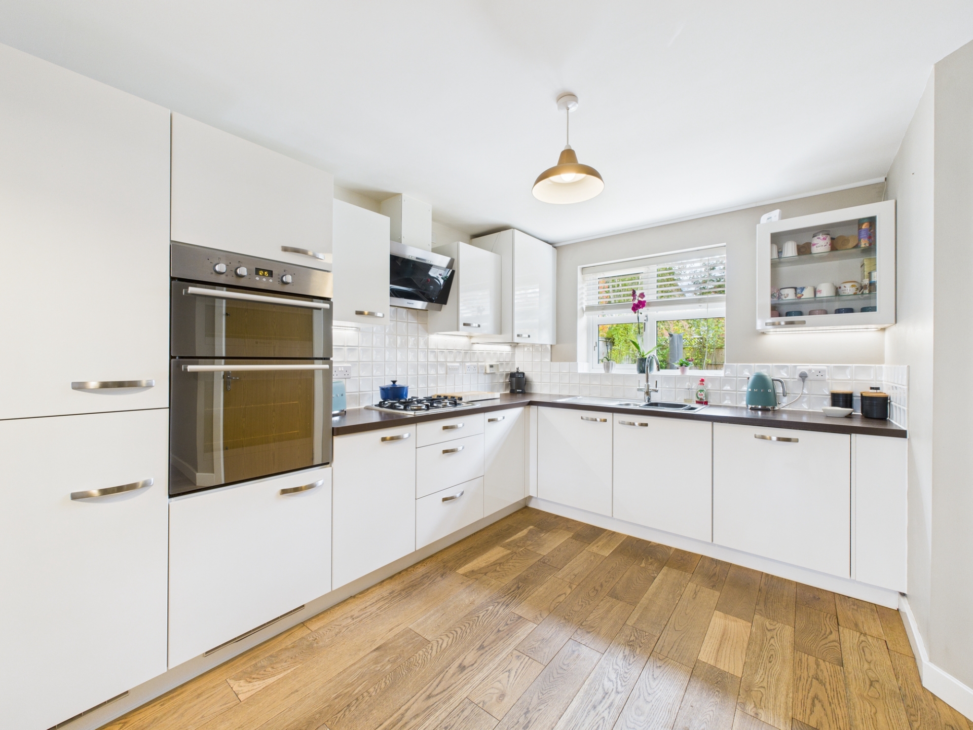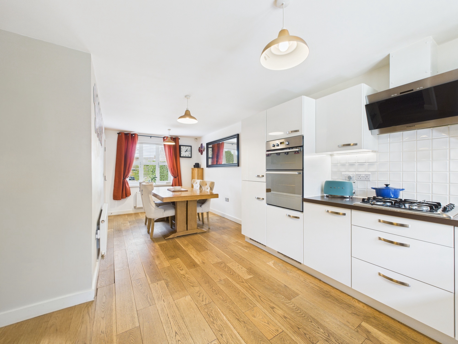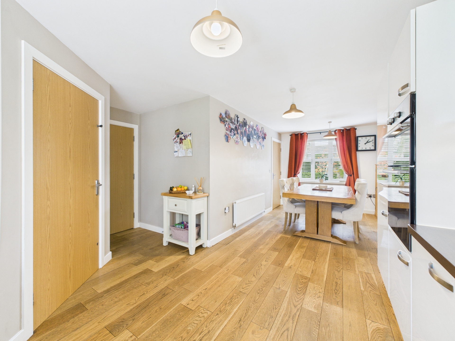 Step into the welcoming hallway, where to the left you’ll find the impressive open-plan, dual-aspect kitchen and dining area. This space features oak flooring, built-in appliances-including a double oven, gas hob with extractor hood, dishwasher, and fridge/freezer-and a seamless flow for family life and entertaining. A door leads to the utility room, which offers additional appliance space, water filtration system and access to the rear garden.