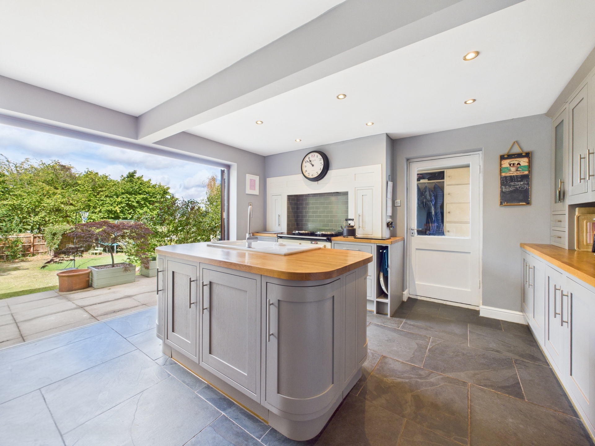 Upon entering, you're greeted by a generous entrance hall providing access to a modern shower room and a bright, airy sitting room featuring elegant hardwood flooring and a feature fireplace. Glazed French doors lead into a stunning open-plan kitchen/dining/family room-undoubtedly the heart of the home. This impressive space boasts an in frame kitchen with wooden worktops, central island, large ceramic sink, integrated fridge/freezer, and a classic Aga. Expansive bi-fold doors open directly onto the rear patio, creating seamless indoor-outdoor living. A separate utility room is conveniently accessed from the kitchen.