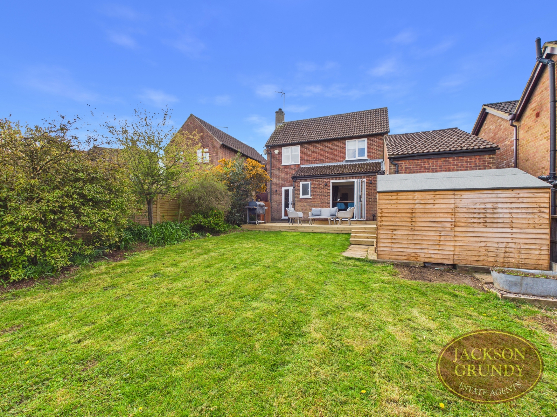To the rear, a decking area leads from the kitchen and steps down to the lawn beyond and a garden shed.