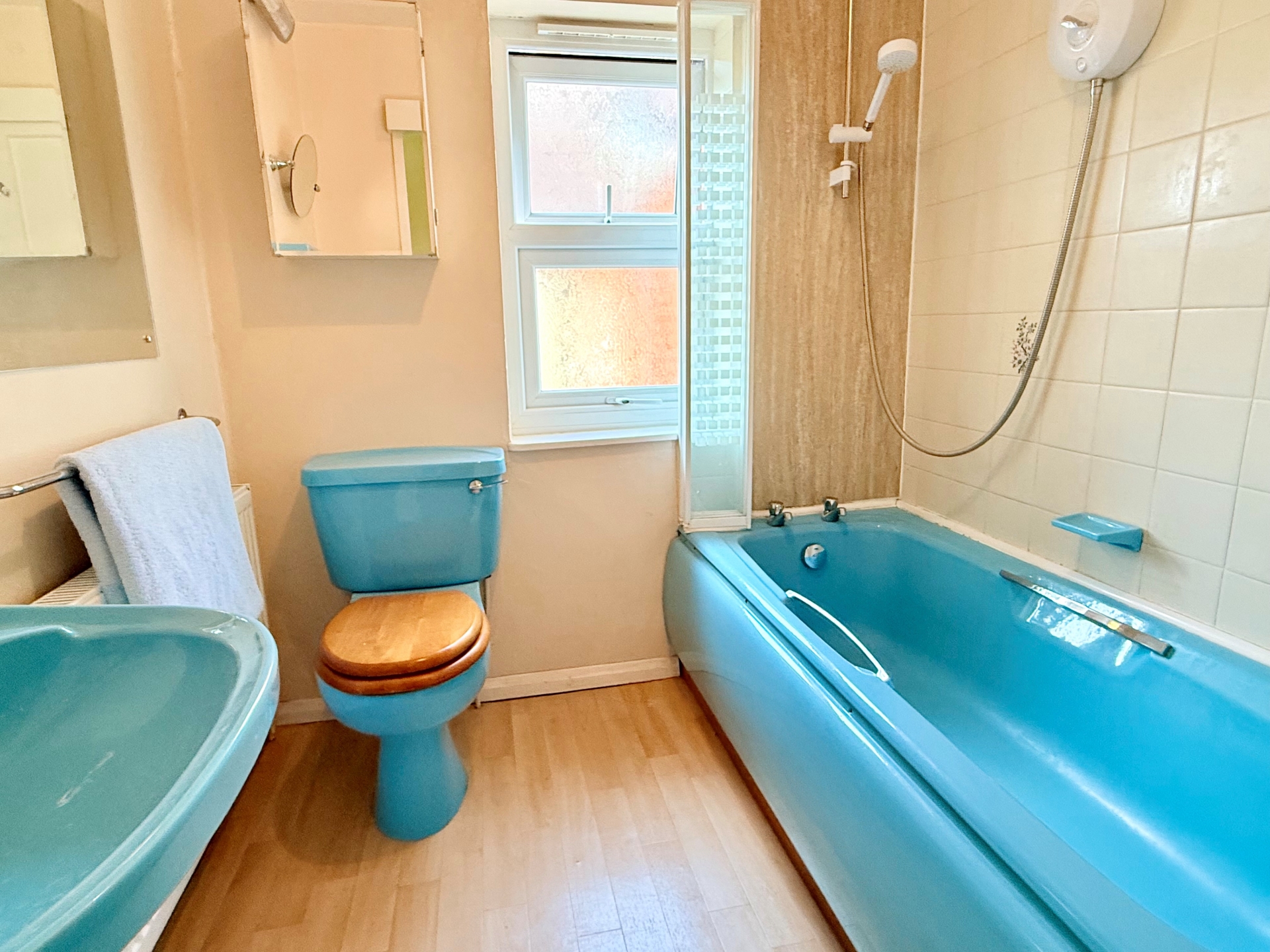 Obscure uPVC double glazed window to side elevation. Radiator. Suite comprising pedestal wash hand basin with mixer tap, WC and panelled bath with shower over. Radiator. Tiling to splash back areas. Wood effect flooring.