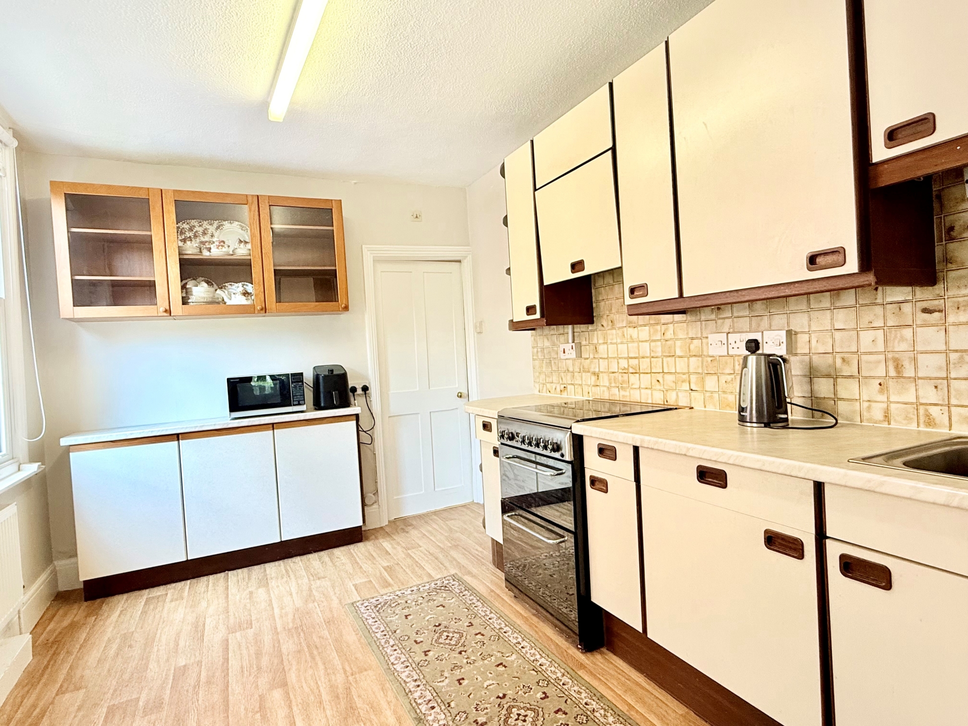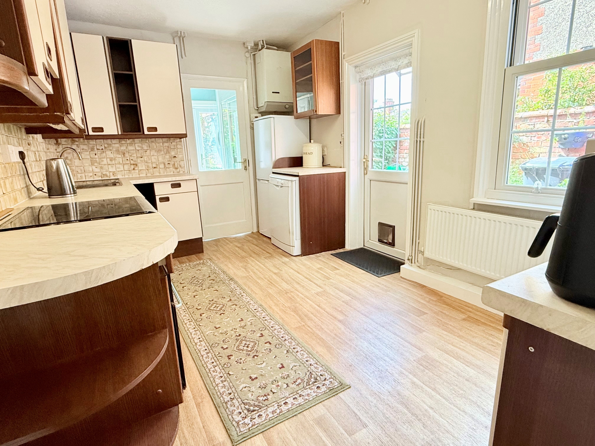 uPVC double glazed sash window to side elevation and double glazed door. Radiator. Wall and base units. Wall mounted boiler. Stainless steel sink. Tiling to splash back areas. Space for cooker, dishwasher and fridge/freezer. Door to: