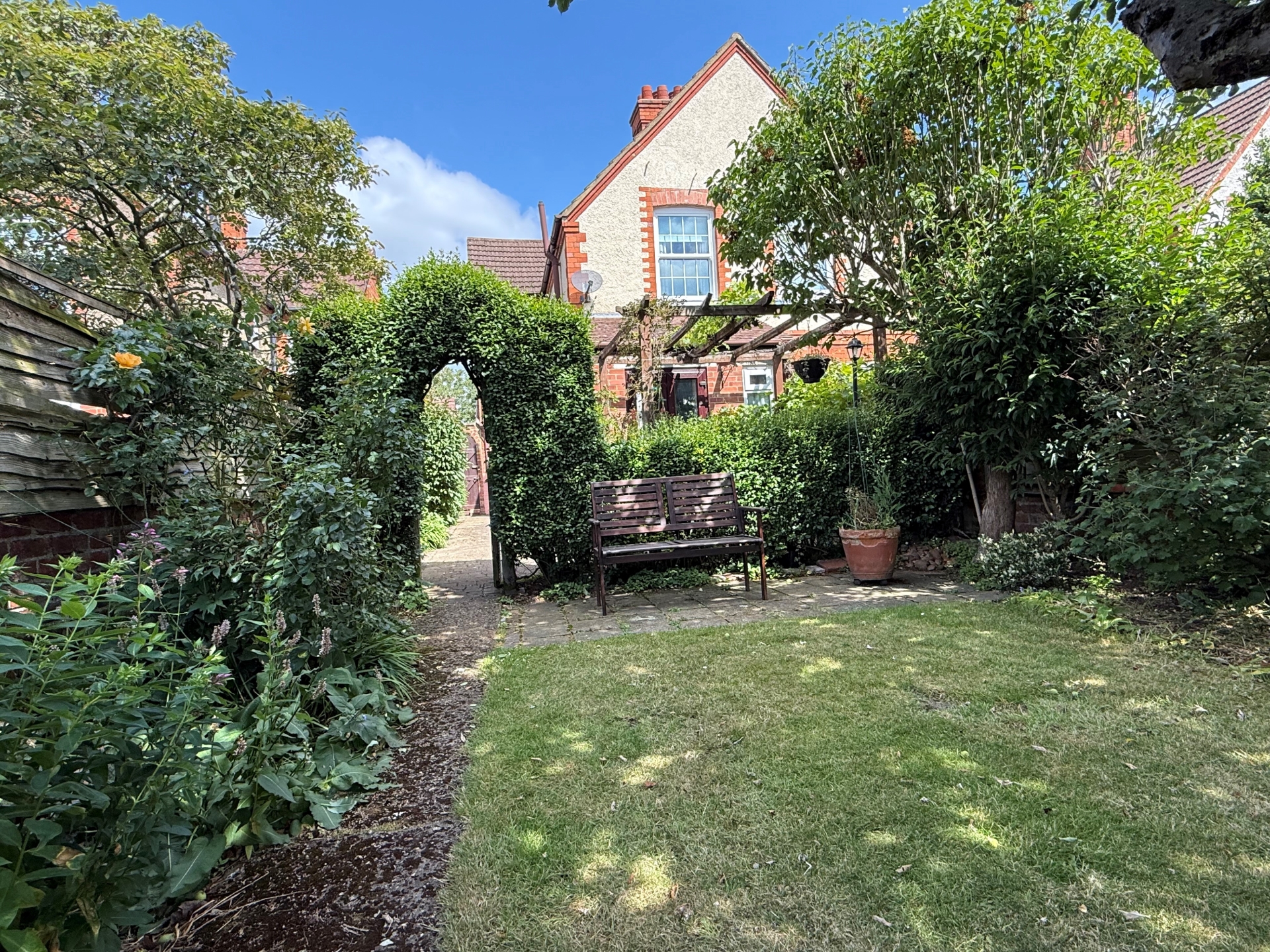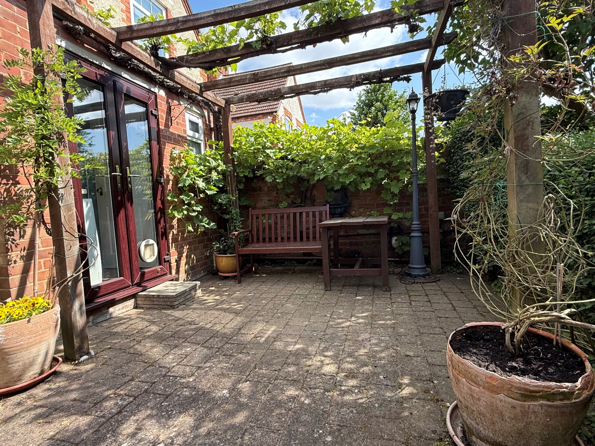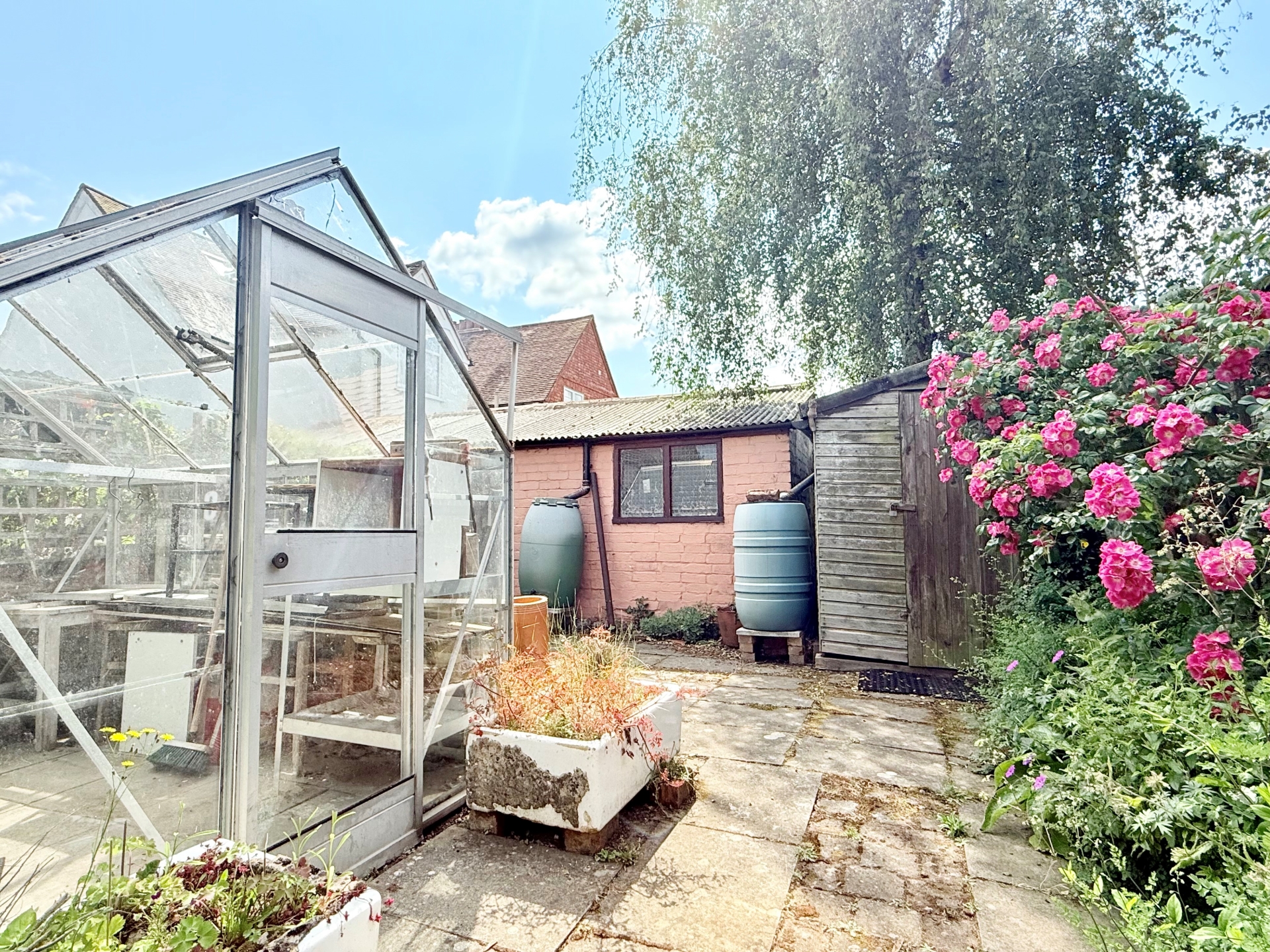 Enclosed by low level brick wall and fencing above. Gate to front. Block patio area with pergola. Privet hedge with gate. Borders. Outside tap. Path to rear. Lawn and borders to rear of garden. Greenhouse to the rear of the garden. Shed and brick outbuilding /store.