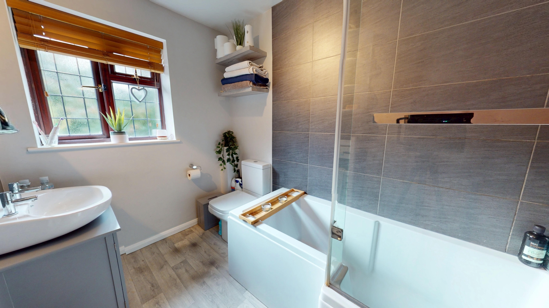 Double glazed obscure glazed window to front elevation. Heated towel rail. Suite comprising P shaped bath with mixer tap and shower attachment, wash hand basin in vanity unit and WC. Extractor fan. Shaver point.
