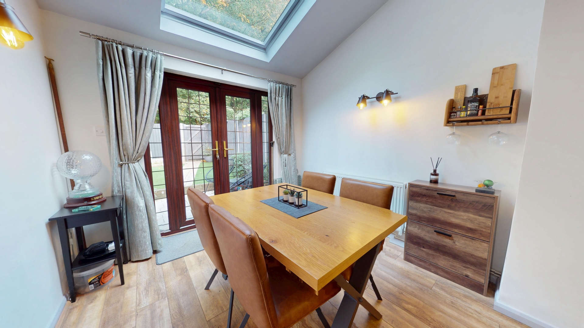 Double glazed French doors with full length glazed windows either side to rear garden. Double glazed Velux window. Radiator. wall lights.