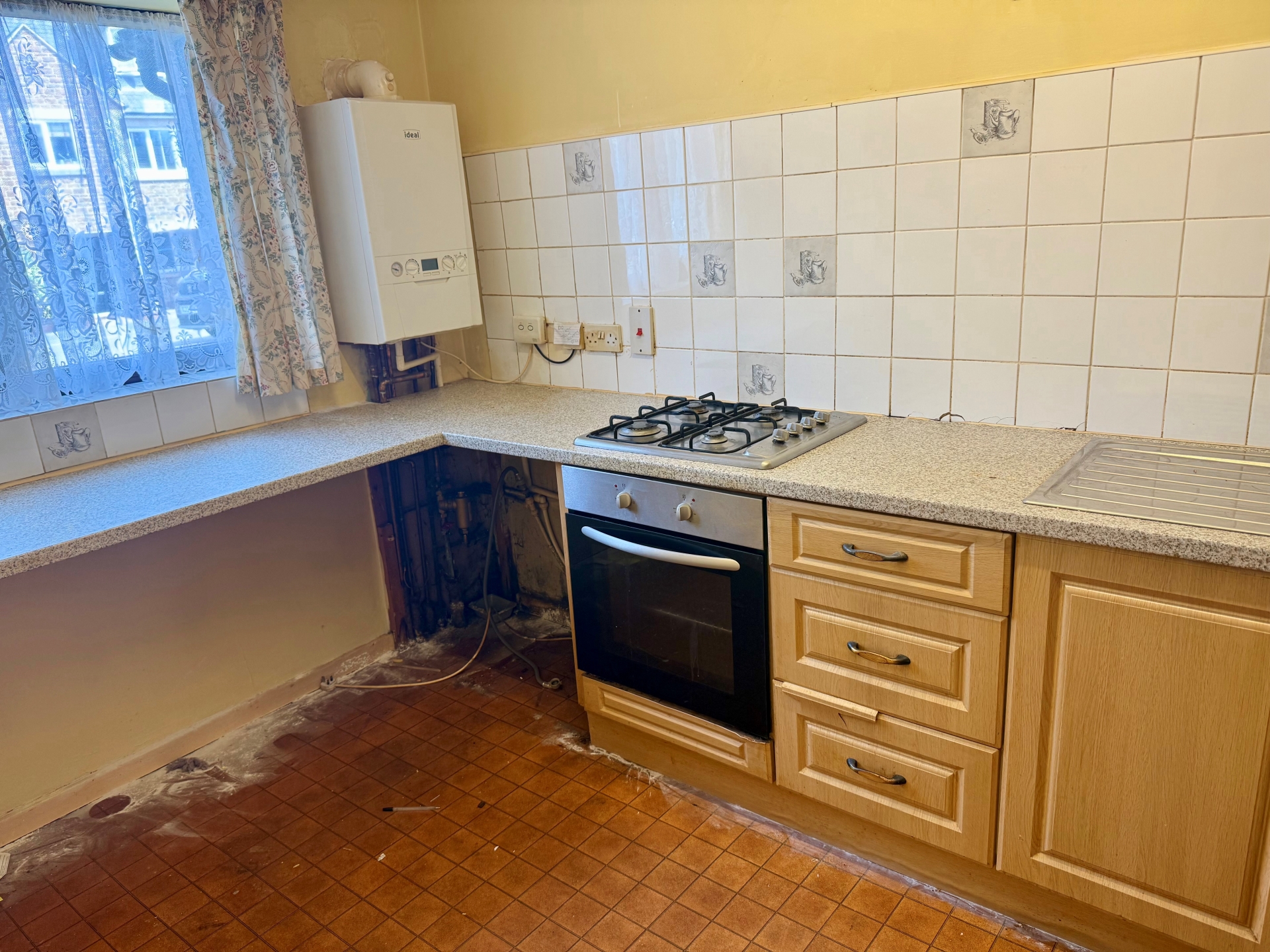 uPVC double glazed window to front elevation. Wall and base unit units. One and a half stainless steel sink with mixer tap. Gas hob and oven. Wall mounted boiler. Space for appliances. Splash back tiling.