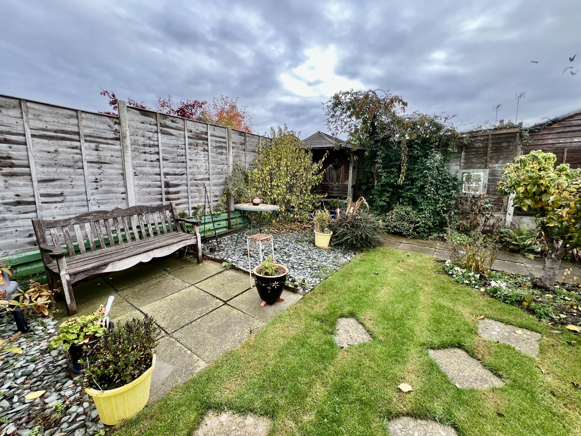Patio stretching across the width of the property.  Mainly laid to lawn with a range of bushes, shrubs and tree borders.  Side access leading to garage and driveway.