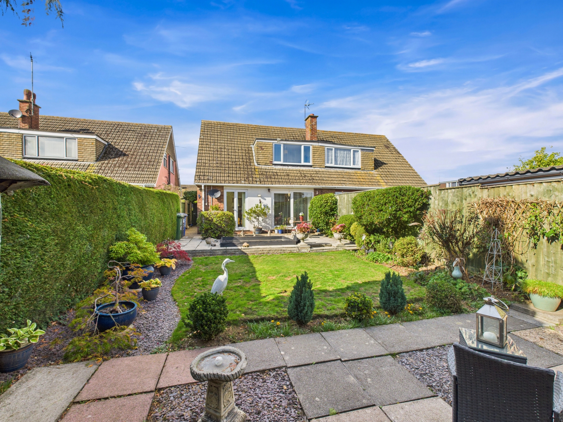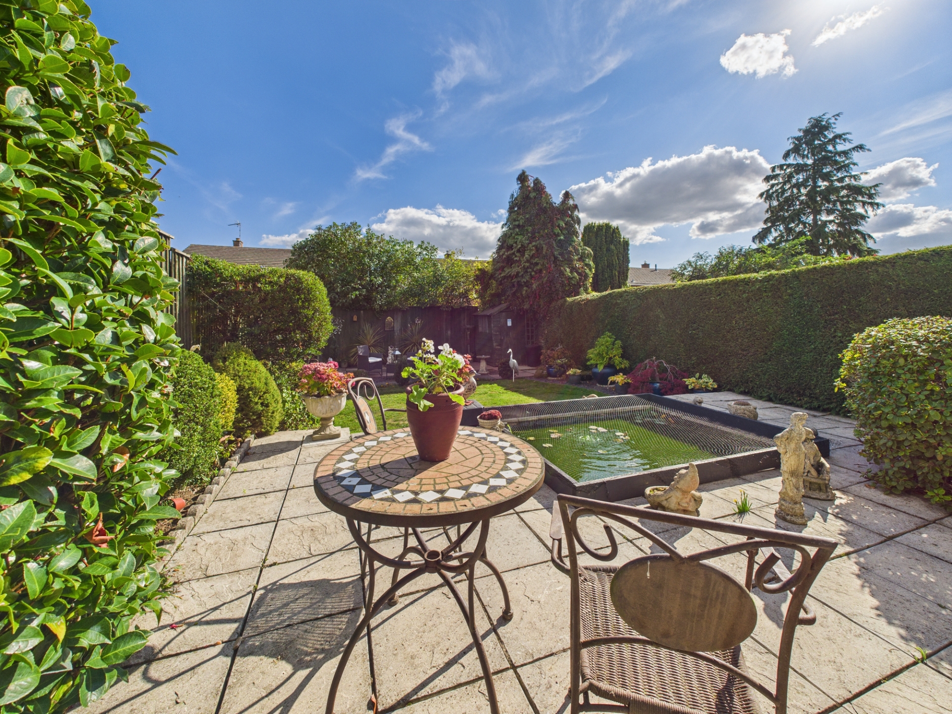 Paved patio around fish pond. Laid to lawn with flower bed borders. Paved patio at rear with timber shed. Enclosed with hedging and timber fence. Gravel borders. Shrubbery border areas. Water tap. The garden enjoys a southerly aspected.