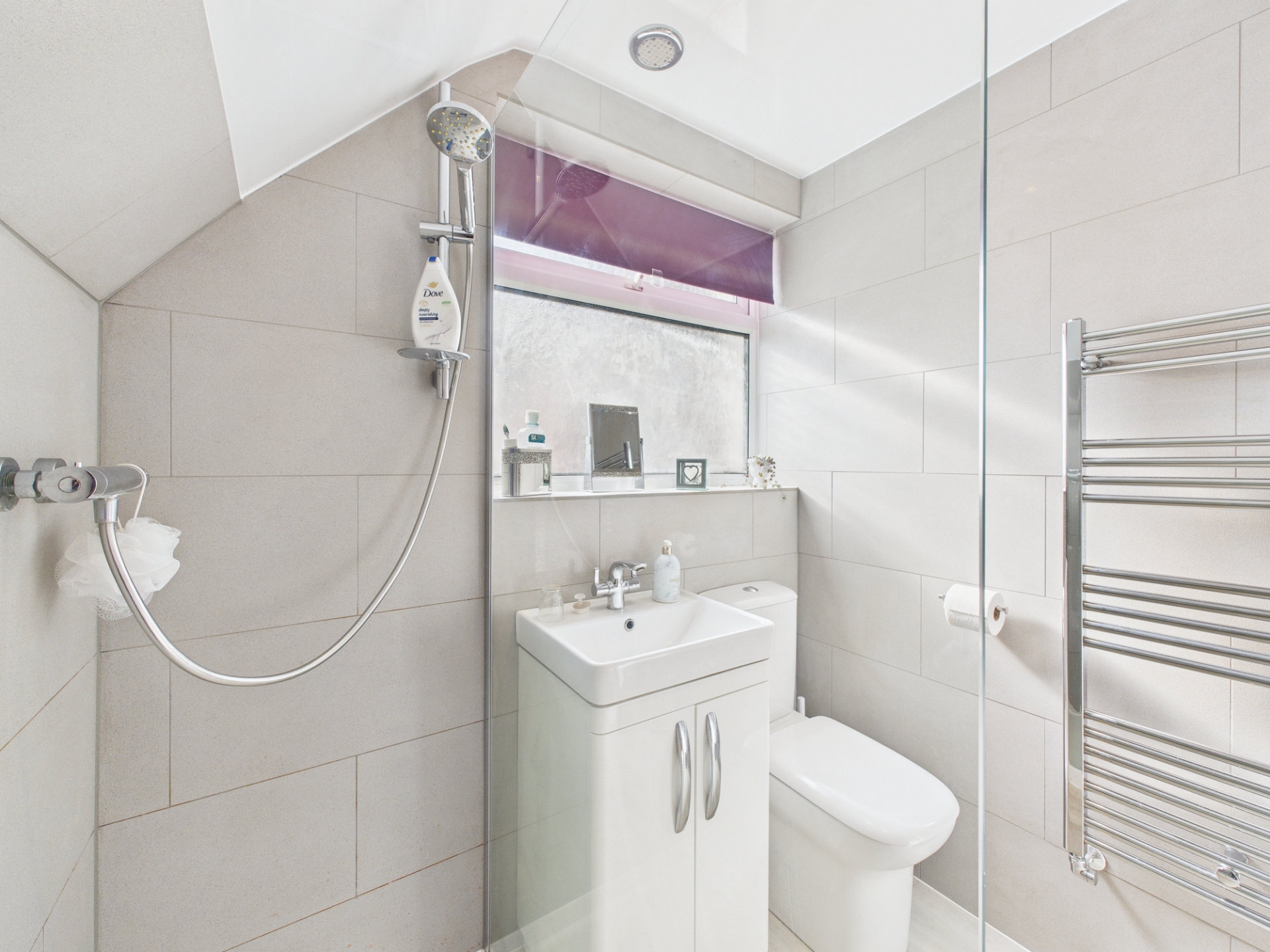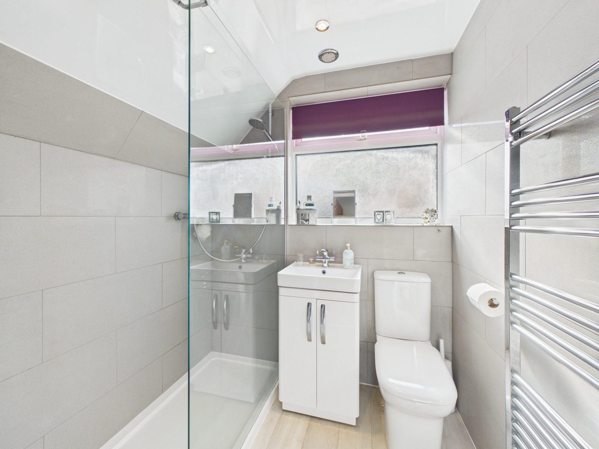 Obscure double glazed window to side elevation. Chrome ladder radiator. Low level WC. Wash hand basin in vanity unit. Tiled shower cubicle. Wood laminate flooring.