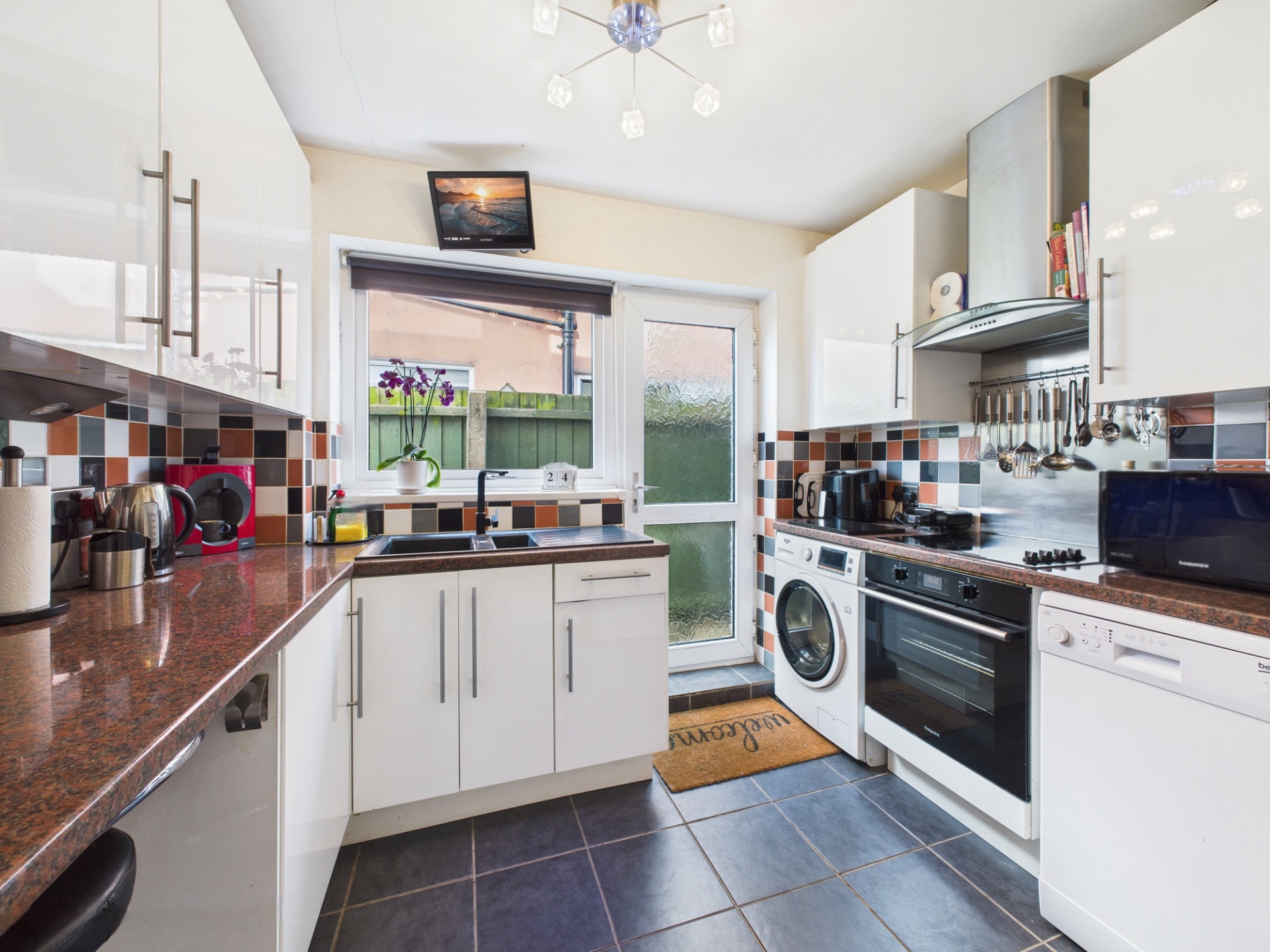 Double glazed door and window to side elevation. Radiator. Gloss white wall mounted and base units. One and a half bowl sink unit with mixer tap. Tiled splashbacks. Built in electric hob, oven and filter hood.