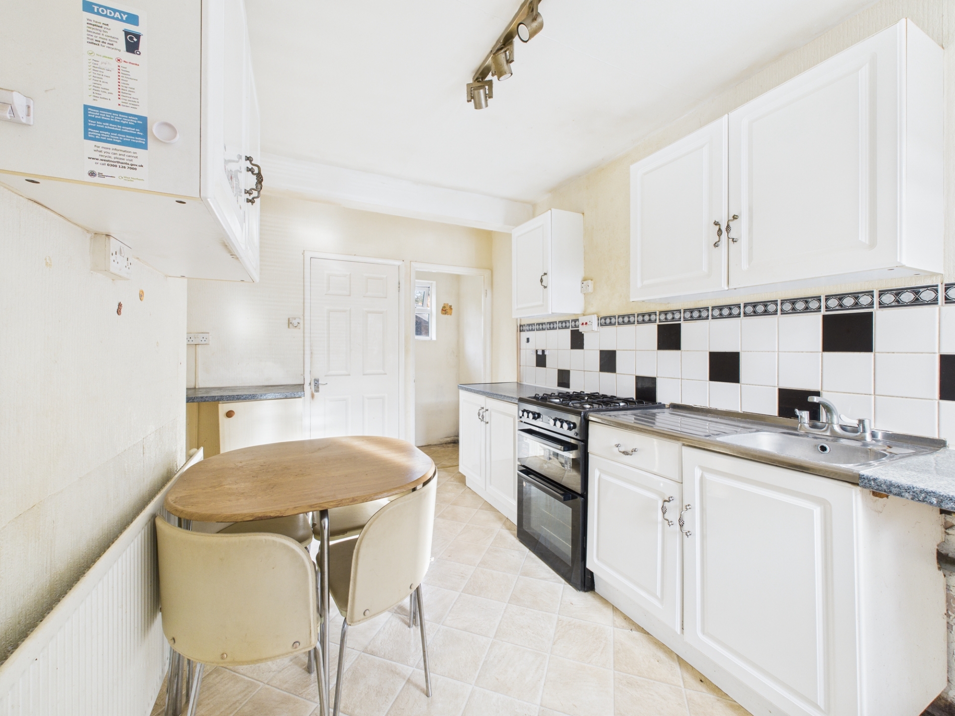 Double glazed window to the front elevation. A range of wall and base units. Lino flooring. Roll top work surfaces. Stainless steel sink with drainer. Access to rear garden. Understairs storage.