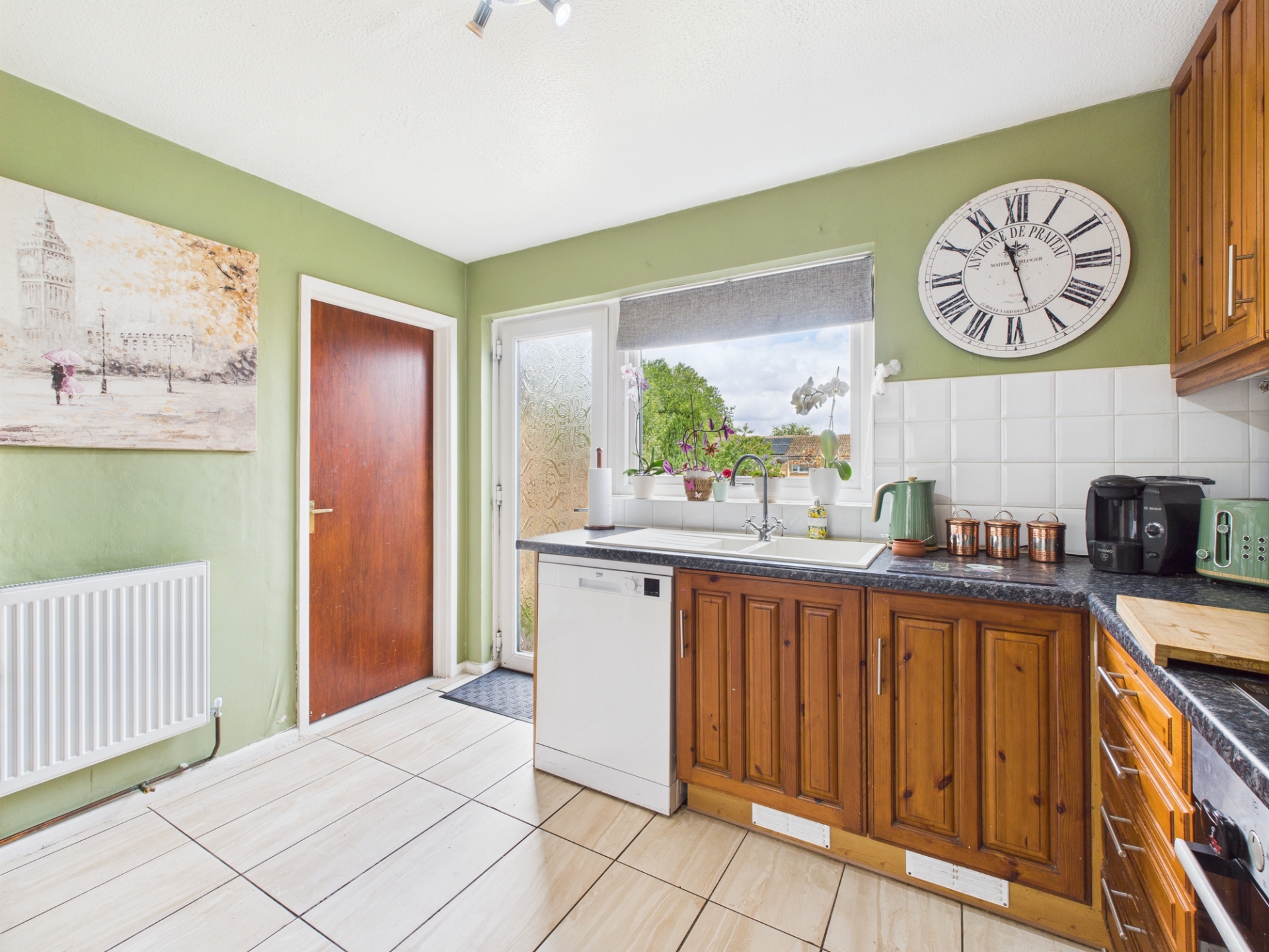 Double glazed door and window to rear elevation. Radiator. Work surfaces. Single drainer one and a half bowl sink with mixer taps. Splash back tiling. Built in electric hob, oven and hood. Tiled floor.