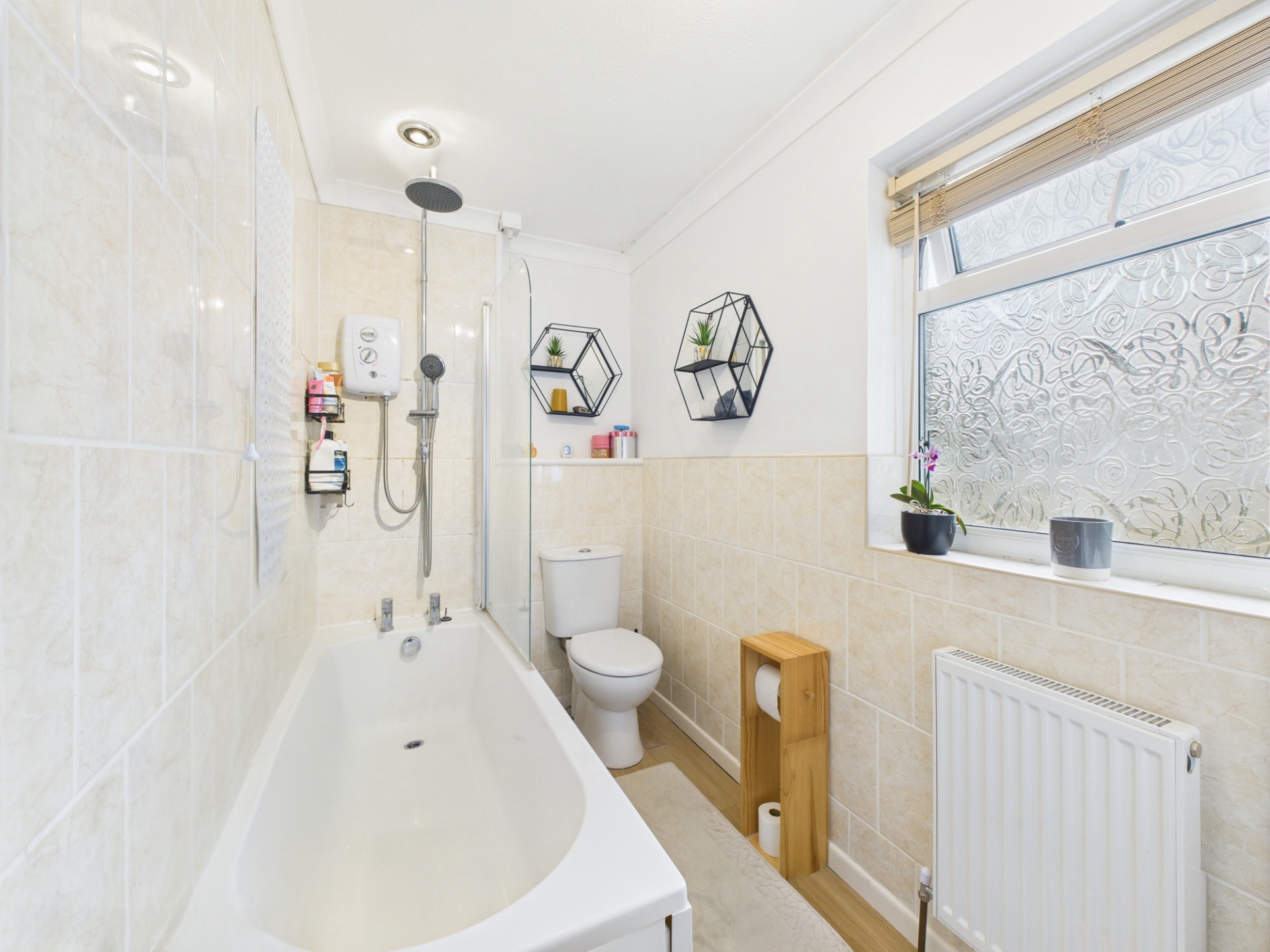 Obscure double glazed window to front elevation. Radiator. Suite comprising panelled bath with electric shower, low level WC and pedestal wash hand basin. Tiling to dado height.