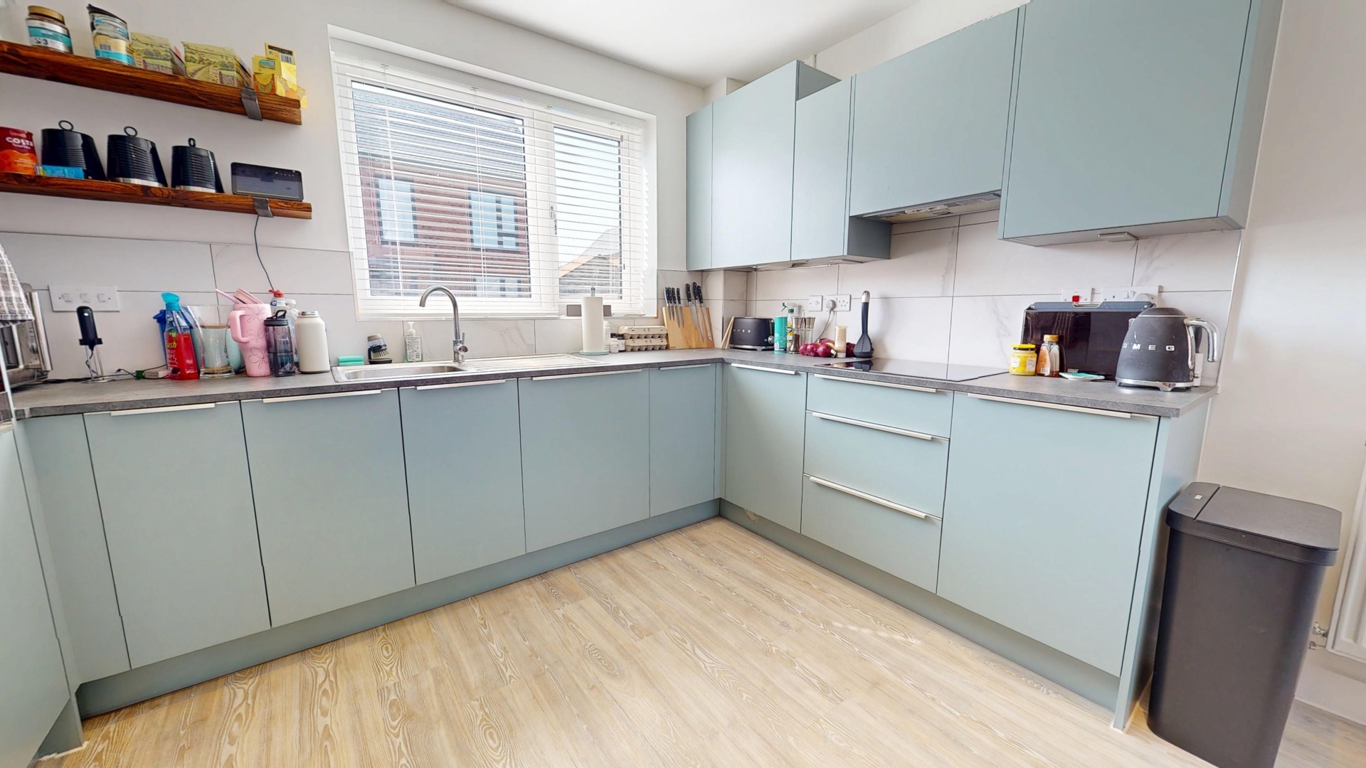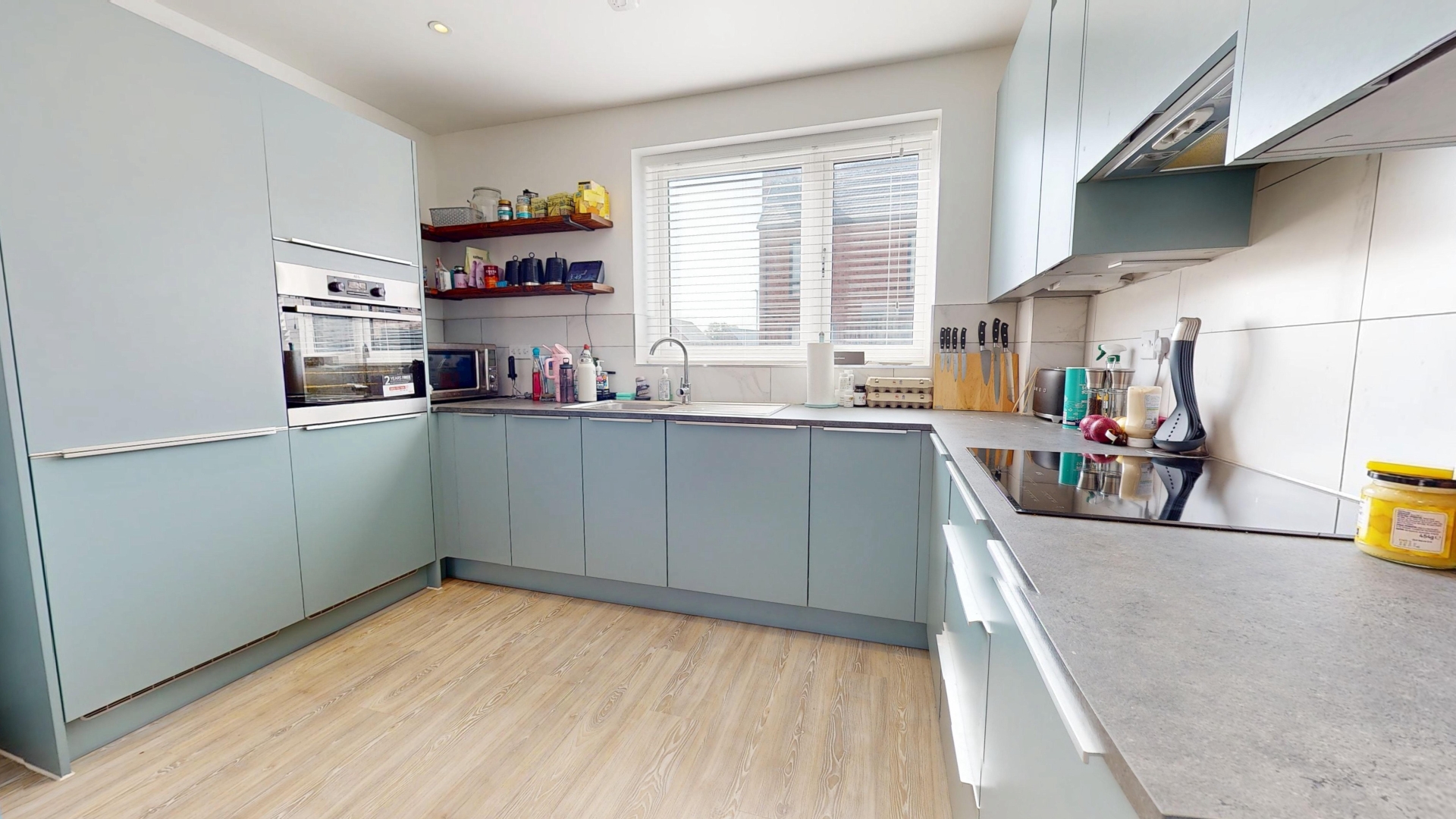 uPVC double glazed windows to front, side and rear elevations. uPVC double glazed single door to rear elevation. Square top work surfaces. A range of wall and base level units. Tiling to splash areas. Stainless steel sink and drainer with stainless steel mixer tap. Induction hob, concealed extractor fan. Integrated dishwasher and fridge freezer, high level wall mounted single oven. Radiator. LVT flooring.