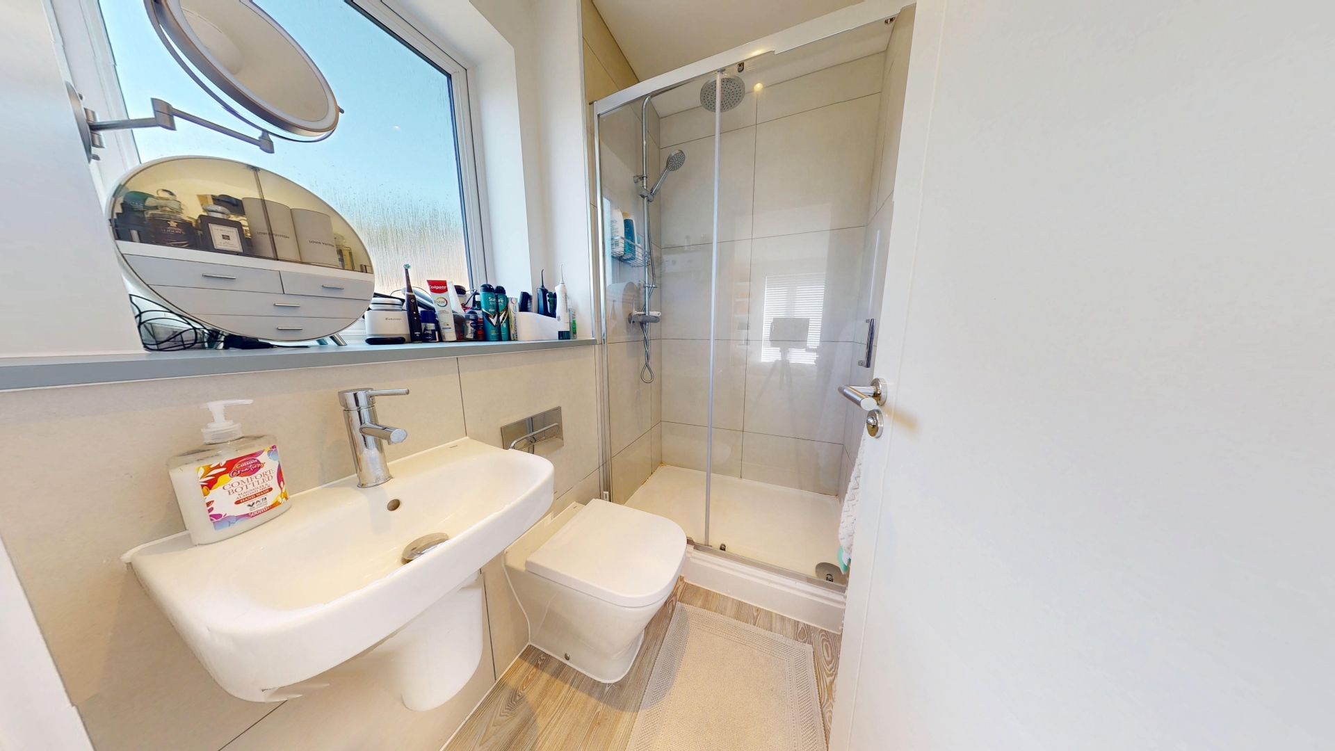 uPVC double glazed obscure window. LVT flooring. Tiling to splash areas. Suite comprising wall mounted wash hand basin with stainless steel mixer tap, low level WC and double shower cubicle.