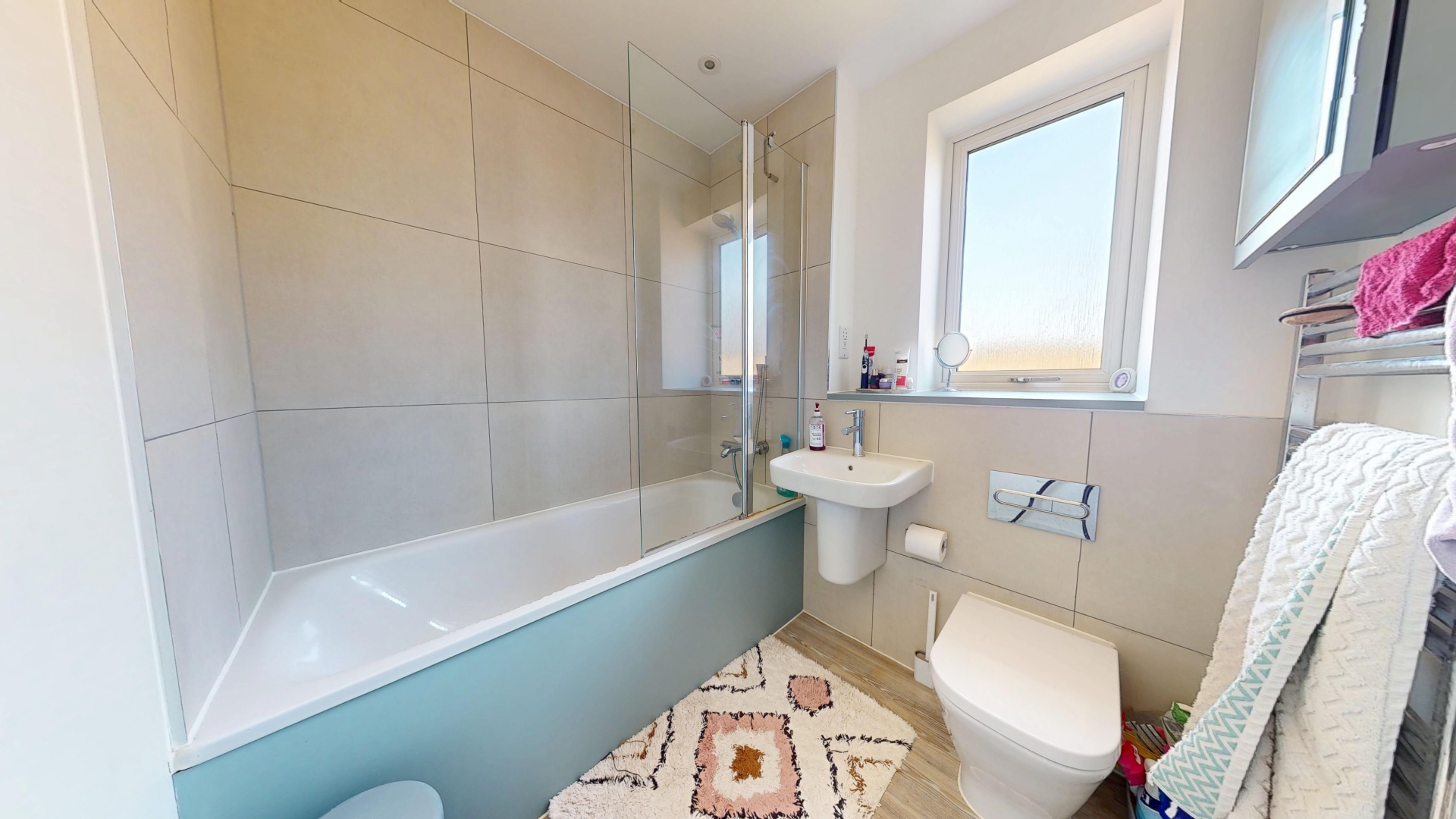 uPVC obscure double glazed window to rear elevation. Chrome heated towel rail. LVT flooring. Suite comprising bath with shower over, wall mounted sink and low level WC. Tiling to splash areas.