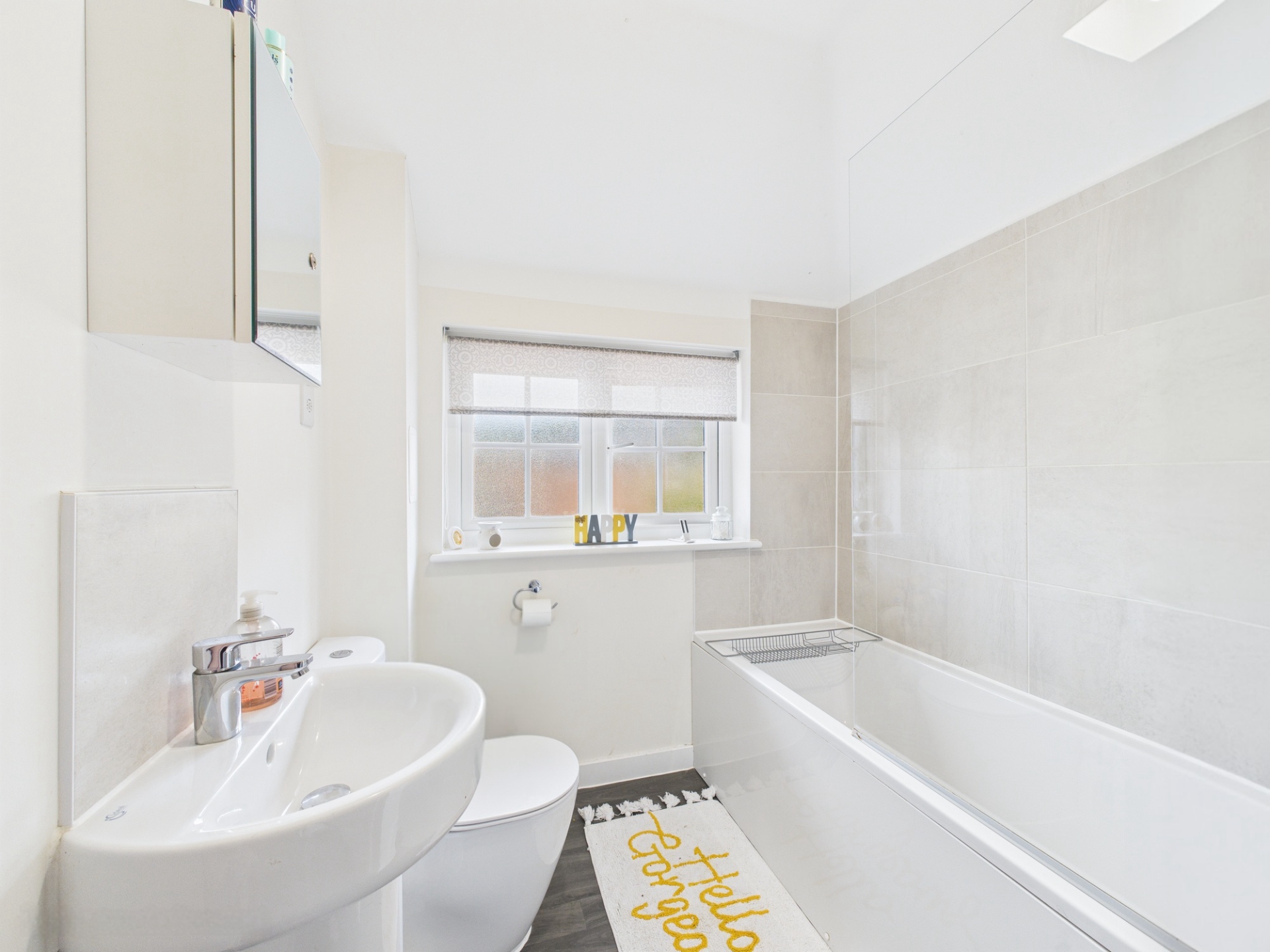 Store cupboard overstairs. Low level WC. Wash hand basin. Towel rail. Bath with electric shower over.