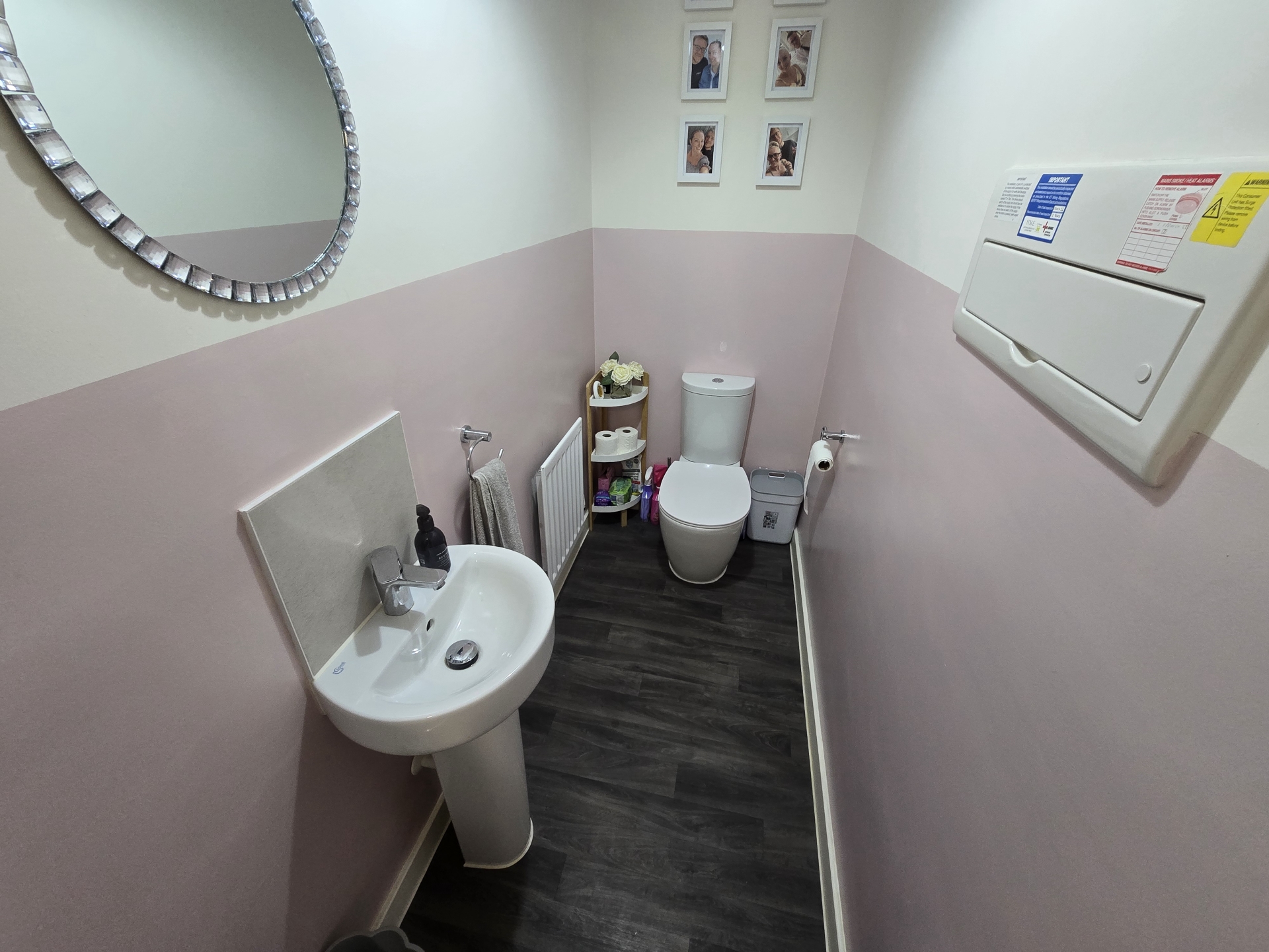 Low level WC. Radiator. Pedestal wash hand basin. Fuse board.